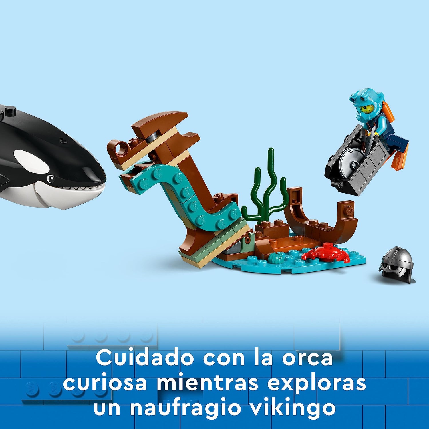 • El set LEGO City Barco Explorador del Ártico es un barco de juguete grande que flota en el agua, un dinghy, un submarino ROV, un naufragio Vikingo, 7 minifiguras de exploradores y una orca de juguete para divertidas exploraciones del océano