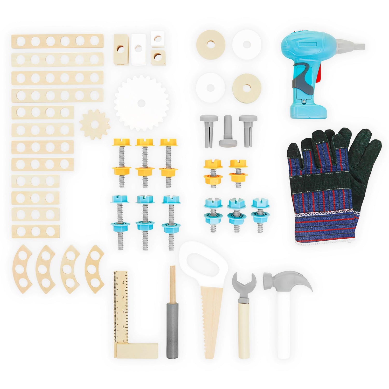 - Kit Completo de 74 Piezas: Herramientas realistas, accesorios y elementos de construcción que despiertan la creatividad. Incluye guantes de trabajo para una experiencia auténtica de taller como un profesional
