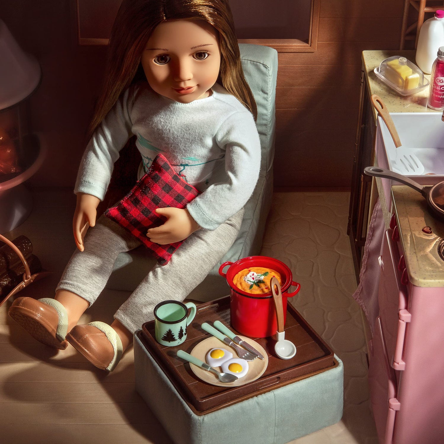 - Numerosos accesorios incluidos para que tus muñecas puedan cocinar y comer tranquilamente: cubiertos, una cafetera, una taza, un cuenco, una sartén con tapa, huevos fritos, botella de zumo, tocino, mantequilla, leche, un plato de comida...