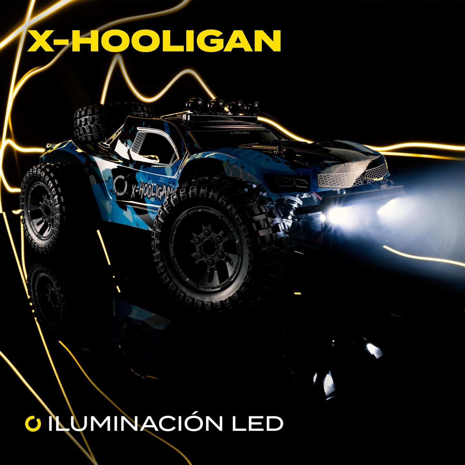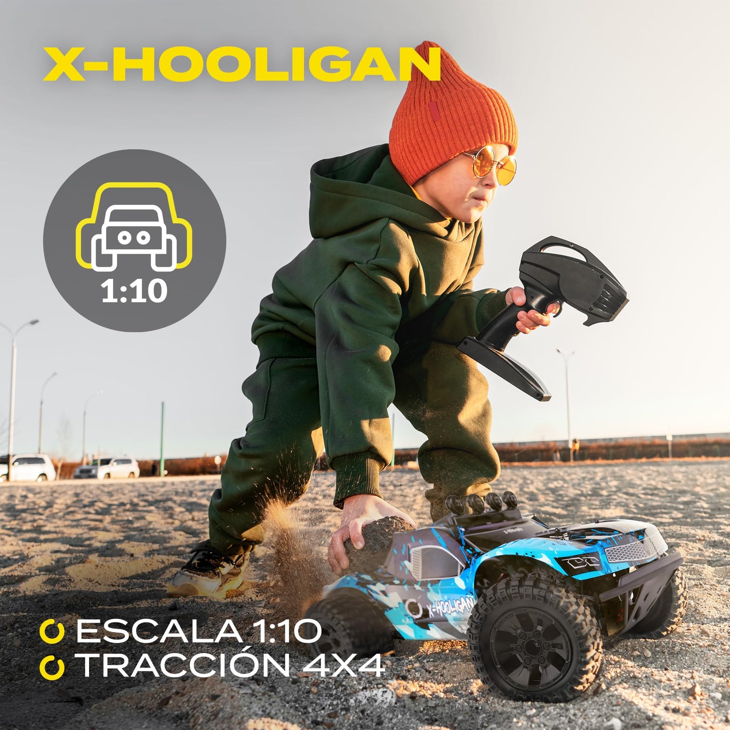 - CONSTRUCCIÓN: El coche Overmax Hooligan es un vehículo grande hecho en escala 1:10. La construcción robusta IPX5 es resistente al agua y al polvo. Las luces LED dan el efecto estupendo a la hora de conducir en oscuridad. El parachoques delantero y los elementos de metal de refuerzo del chasis protegen el juguete al chocar