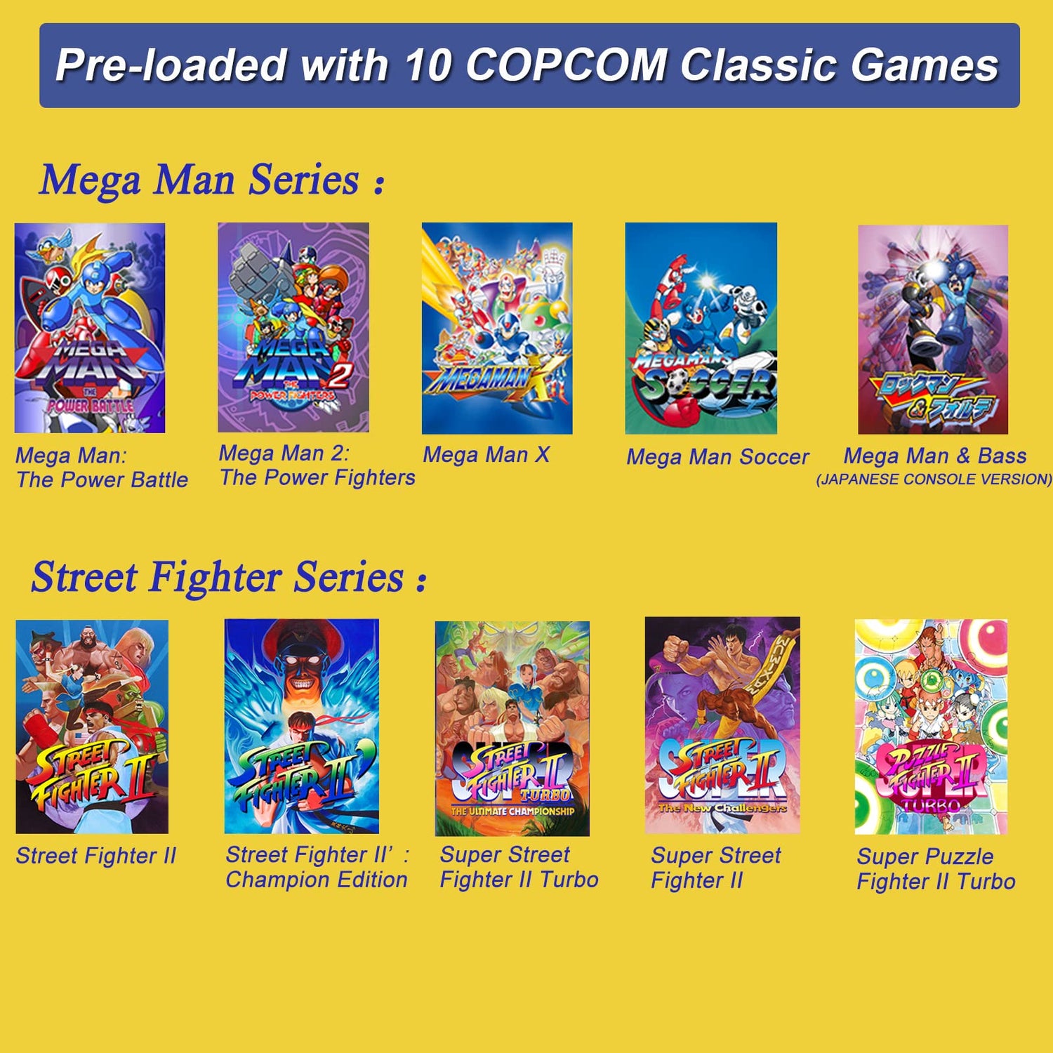 - 【RETRO STATION Arcade con 10 juegos clásicos de CAPCOM con licencia】: este arcade retro proviene de un diseño azul y amarillo que te recordará los viejos tiempos y los mejores recuerdos con MEGA MAN y STREET FIGHTER, incluidos [Mega Man: The Power Battle], [ Mega Man 2: The Power Fighters], [Mega Man X], [Mega Man Soccer]; [Street Fighter II], [Street Fighter II': Champion Edition], [Super Street Fighter II], [Super Street Fighter II Turbo], [Super Puzzle Fighter II Turbo].