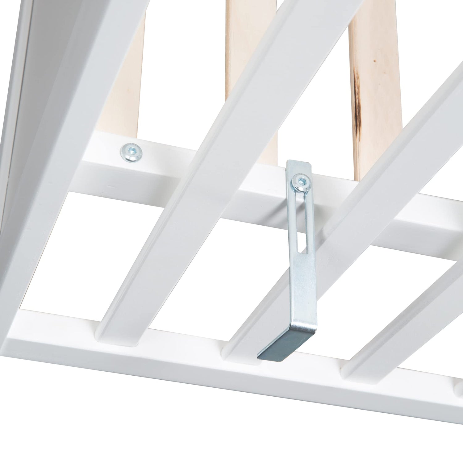 - FIJACIÓN INTEGRADA: la cama evolutiva se puede fijar firmemente al panel lateral (espesor máximo de 4,5 cm) de la cama parental mediante el gancho metálico fijado al somier