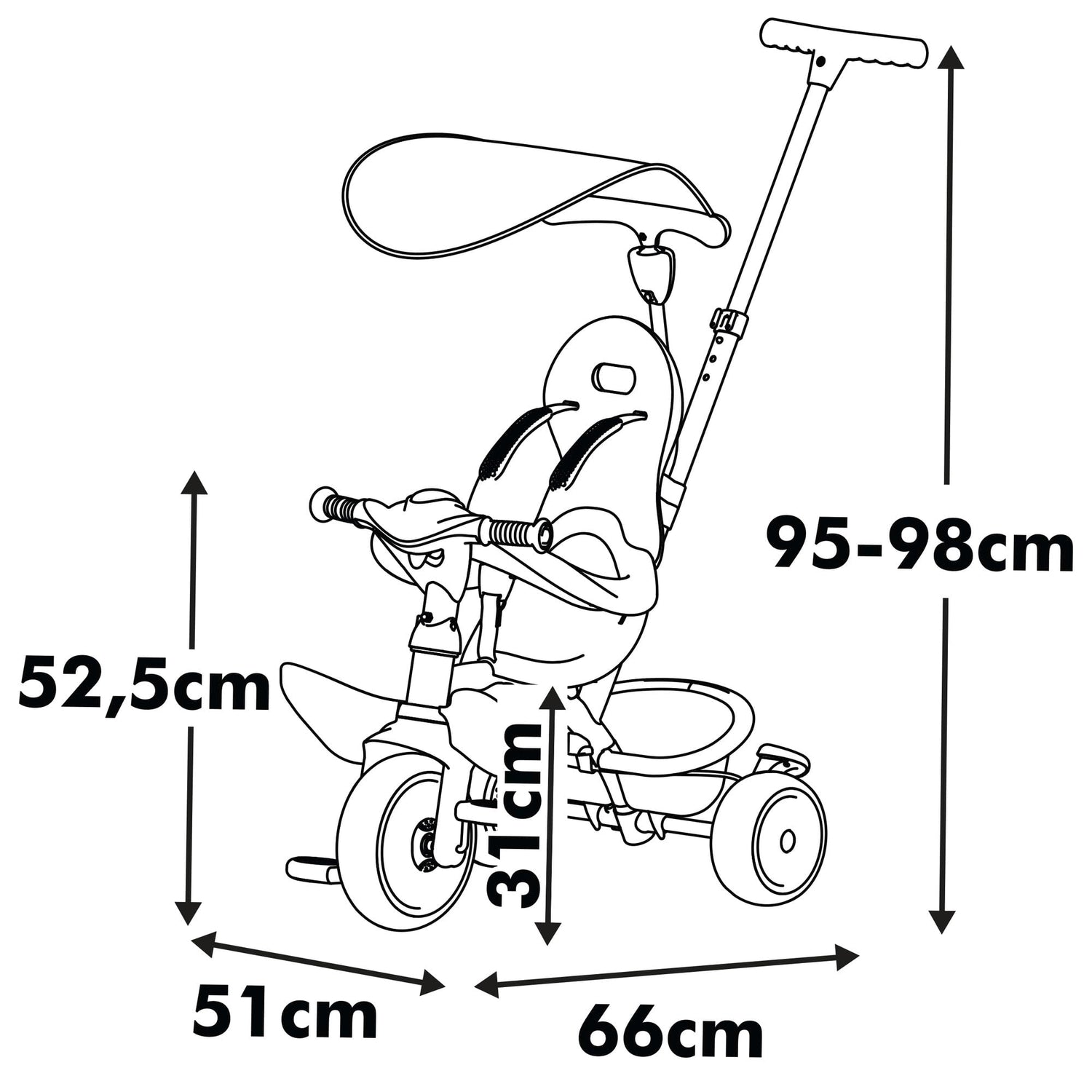 • Parasol y protección: Parasol anti-UV 360° para proteger a tu bebé del sol y barra parental ajustable (hasta 98 cm), permitiendo el control total del triciclo mientras tu pequeño se divierte