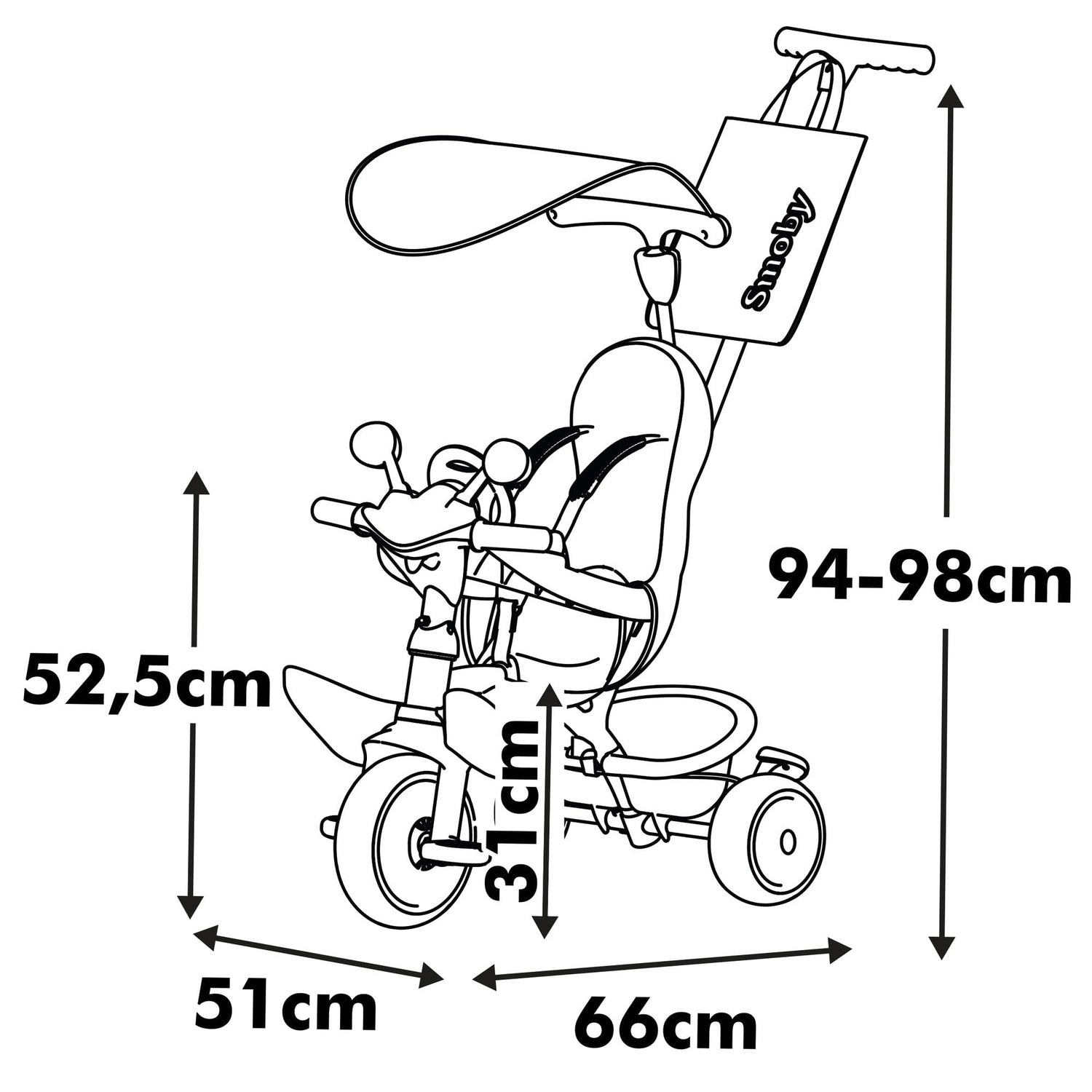 - Fácil de dirigir y cómodo para los padres: La barra parental ajustable (hasta 98 cm) permite a los padres controlar el triciclo sin esfuerzo, asegurando paseos cómodos y seguros; incluye un volante con claxon integrado para mayor diversión