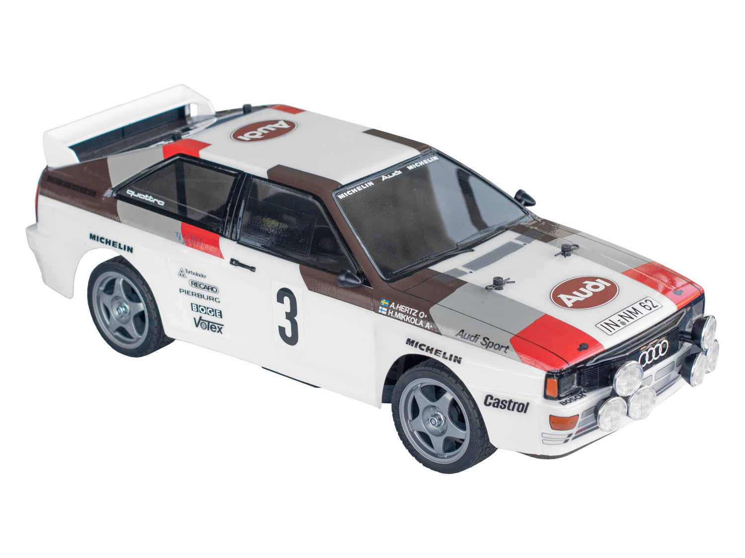 - Carrocería de policarbonato transparente fiel al original Audi Quattro A2, con piezas de montaje (espejo, alerón trasero) incluidas.