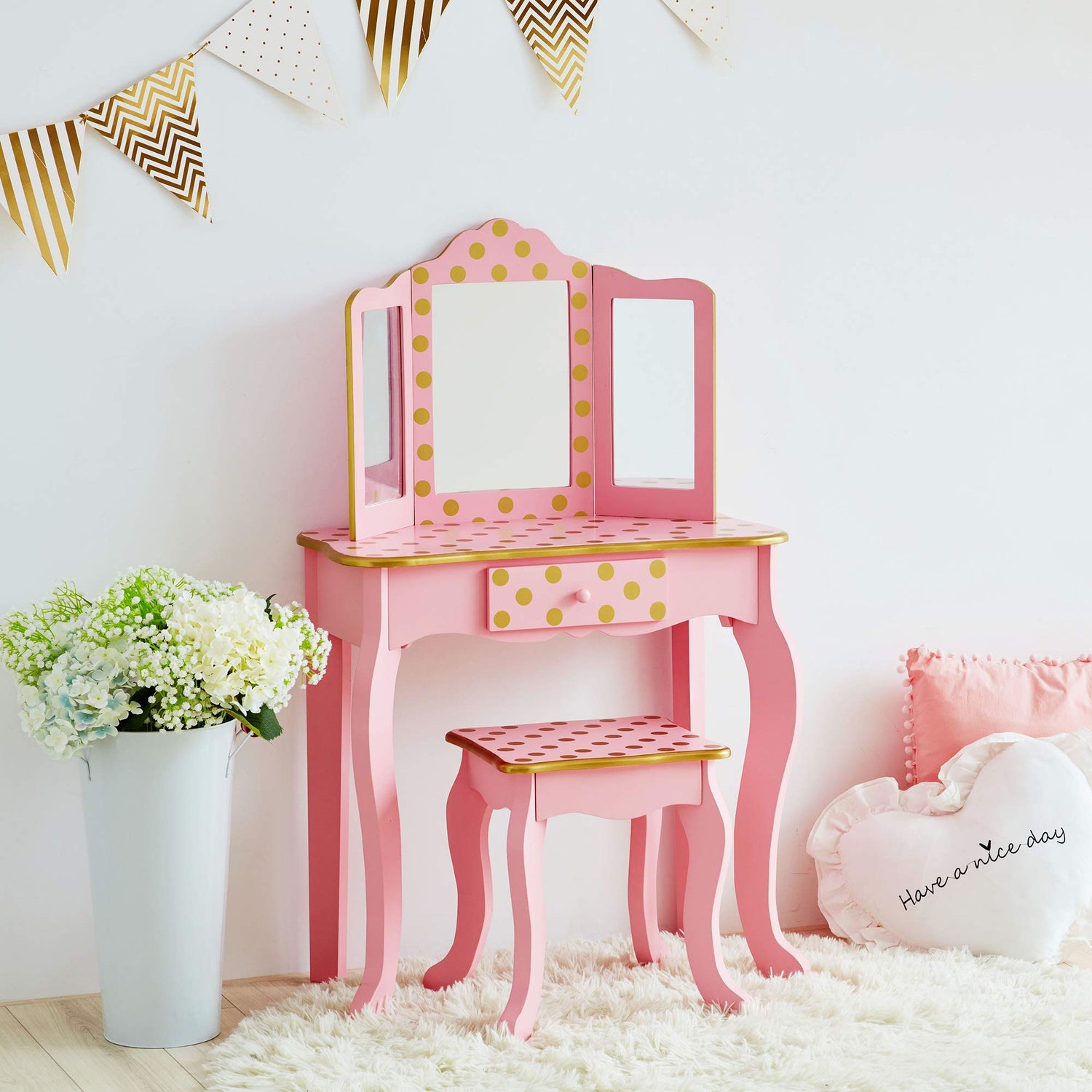 - DISEÑO: Hermoso tocador rosa y dorado con 3 espejos y un cajón central extraíble con una perilla que brinda un área de almacenamiento espaciosa.