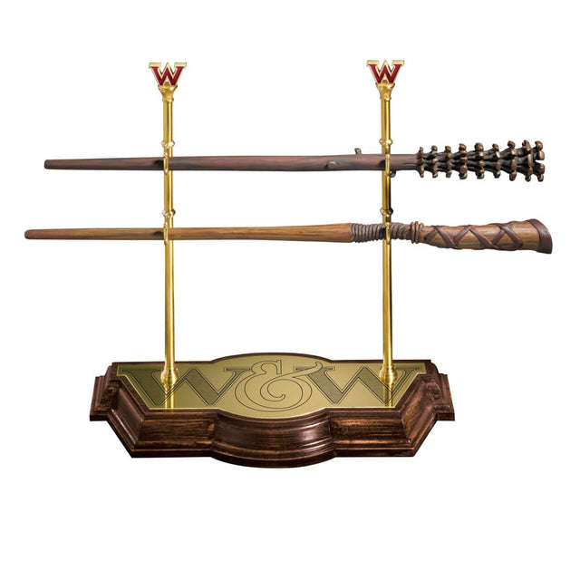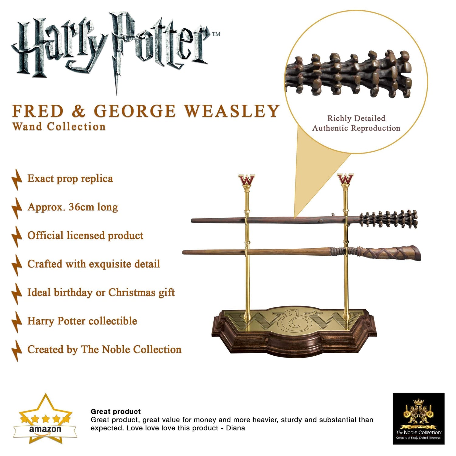 - Las varitas de los gemelos Weasley, Fred y George, vienen completas con un elegante soporte de exhibición de metal fundido y madera. Las varitas de Fred y George están disponibles exclusivamente en este juego de The Noble Collection y no se venden por separado.