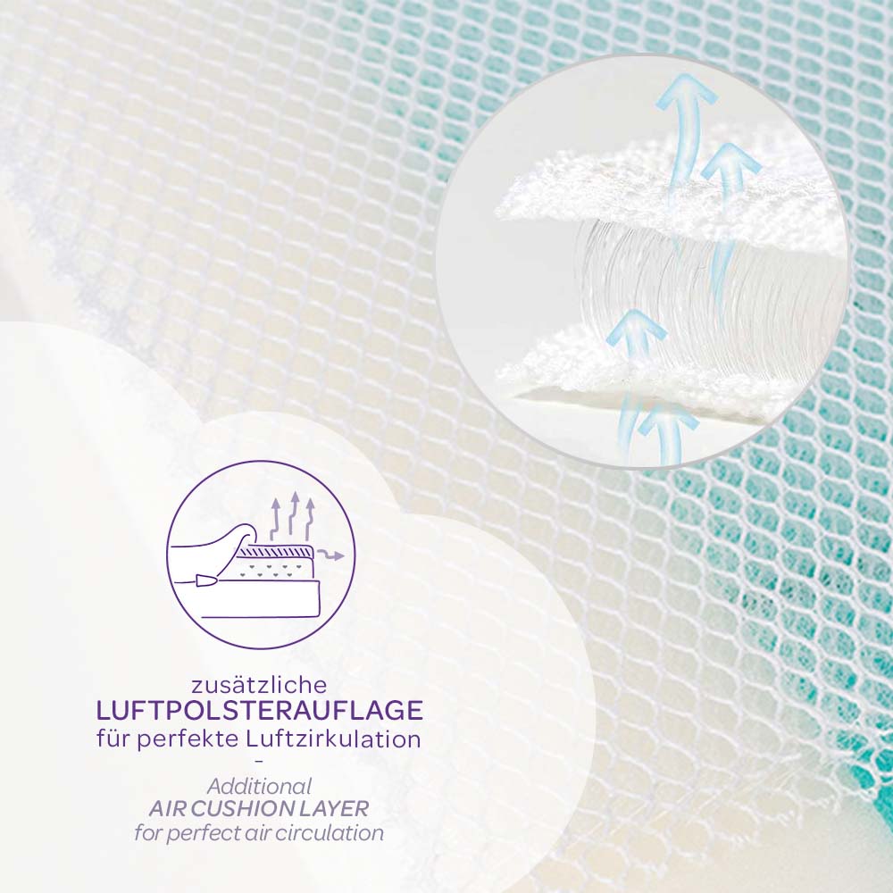 - Funda transpirable y suave: gracias a la combinación de materiales de 38% TENCELTM y 62% poliéster, la funda es especialmente transpirable, regula la humedad y es agradable para la piel. Acolchado con un acolchado de aire 3D en la parte superior que permite una óptima circulación del aire, por lo que tu bebé puede respirar incluso cuando duerme con la boca sobre el colchón.