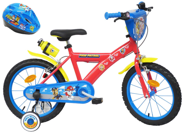 Vélo ATLAS 16 Bicicleta Infantil Pulgadas, Pat, Equipada con 2 Frenos, bidón/portabidón Guardabarros, Placa Frontal, estabilizadores extraíbles + Casco Patrulla Canina Incluido, Niños, Rojo
