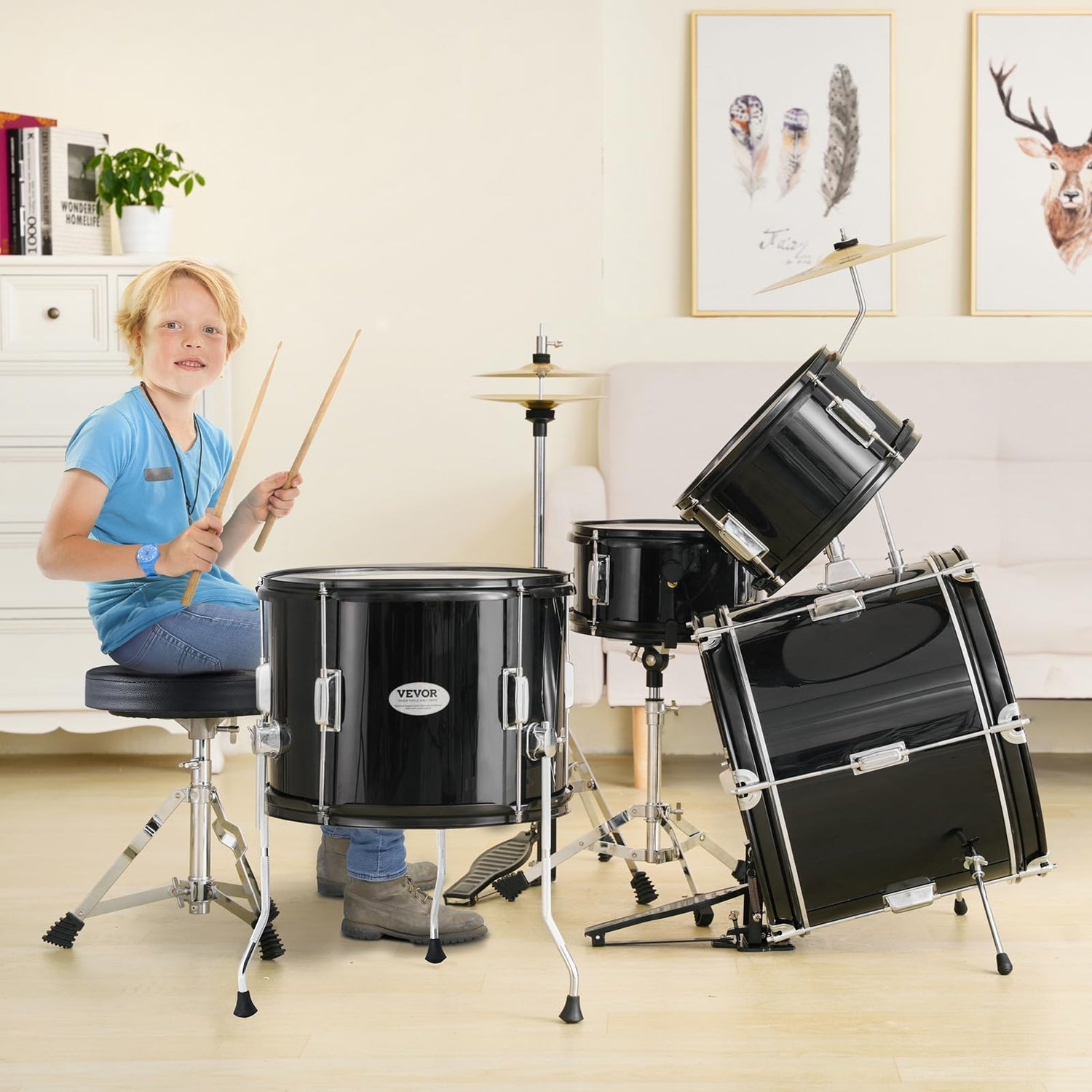 VEVOR Juego de Batería para Niños de Cinco Piezas, Juego Completo de Batería para Niños Principiantes con Bajo, TOMS, Caja, Bombo, Trono Ajustable, Pedal de Charles y Dos Pares de Baquetas, Negro