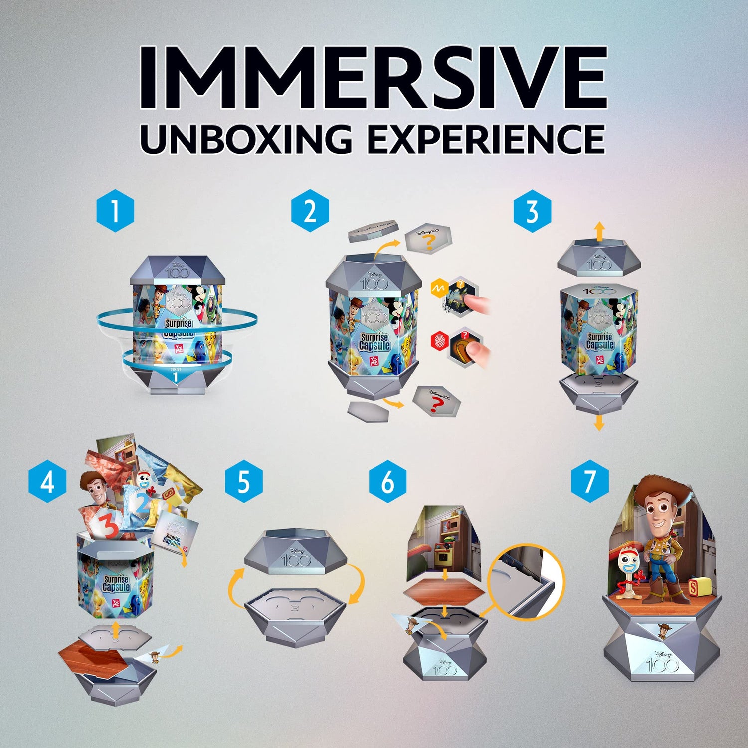 - MÚLTIPLES SORPRESAS EN EL INTERIOR: cada cápsula contiene tarjetas con pistas, tarjetas con escenas, un personaje sorpresa y un accesorio. ¿A quién desempaquetarás?