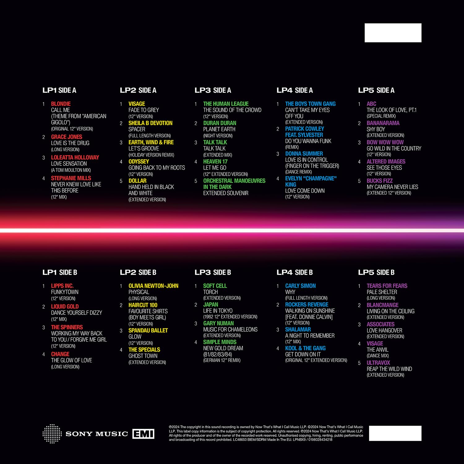 Comenzando con la enorme versión completa de Blondie de Call Me y la versión larga de Grace Jones se enfrenta a Love Is The Drug, LP1 se queda en 1980 con clásicos influyentes de Loleatta Holloway y Change, además de discoteca electrónica de Lipps Inc. y rellenos de suelo de Liquid Gold y The Spinners... de Visage fue lanzado a finales de 1980 y la versión 12 abre LP2 por delante del atemporal "Spacer" producido y escrito por Chic de Sheila & B. Devoción. Los favoritos de la pista de baile de 1981 se presentan de Earth, Wind & Fire y Odyssey, por delante de las versiones extendidas de 12 & # x2019 de gemas pop de Dollar, Haircut 100 y Physical de Olivia Newton-John. 1981 fue un año estelar para los artistas del Reino Unido en las listas, e incluido aquí, Duran Duran con la & # 8216Night Version & # 8217 de Planet Earth, las 12 versiones de The Human League & # 8217s & # 8217 The Sound Of The Crowd & # 8217 y & # 8217Glow de Spandau Ballet, además de la versión extendida de la #1 & # x00030 Ghost Tower. n por The Especiales. LP3 continúa la celebración con elementos esenciales de synth-pop, versiones extendidas de Talk Talk, Heaven 17, Orchestral Manoeuvres In The Dark, Soft Cell, Japón, Gary Numan y Simple Minds.