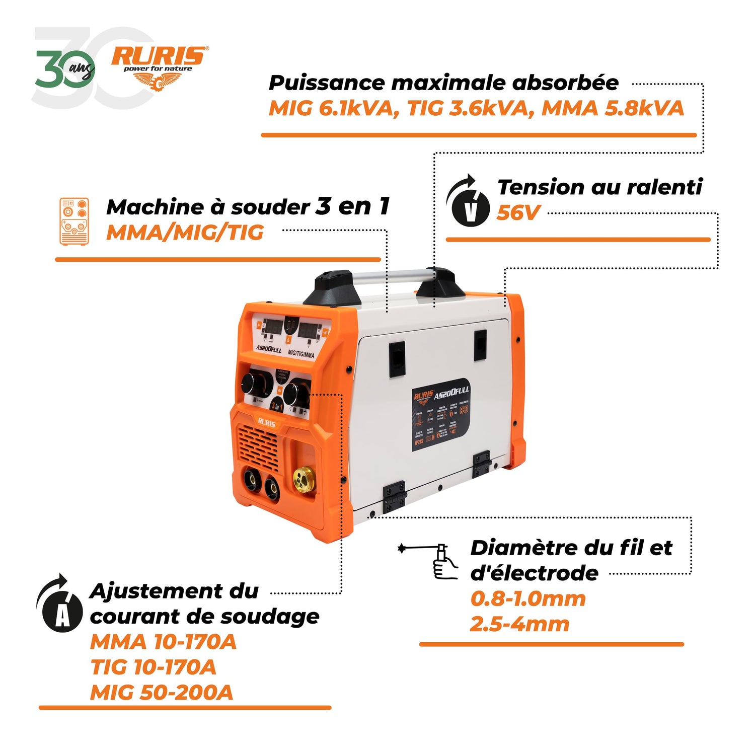 RURIS - Estación de soldadura inversor AS200FULL 200A – MIG/MAG sin gas, LIFT TIG, MMA – 230 V, 60% Duty Cycle, Ø Alambre 0,8-1 mm, Ø electrodos 2,5-4 mm, kit completo incluido