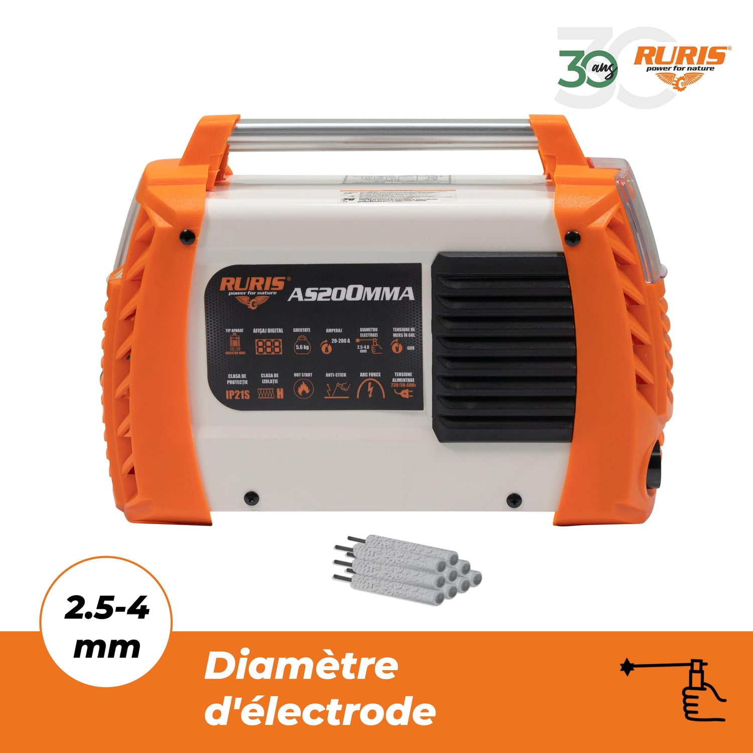 RURIS - Máquina de soldadura Ruris AS200MMA + máscara + martillo/cepillo + 2,5 kg electrodos rutilicos 3,2 mm + imán + guantes + máscara de soldadura soldador con células solares + delantal