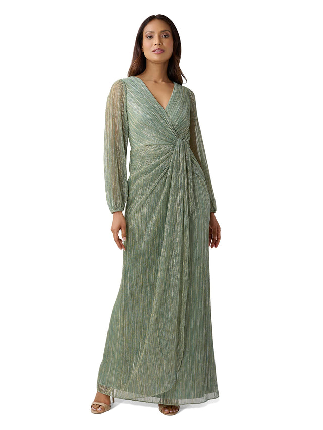 Clásico y brillante, nuestro vestido largo hecho de una malla texturizada arrugada está acabado con un llamativo brillo metálico. Estamos obsesionados con el detalle retorcido y recogido en la cintura que favorece tu figura. Todos los detalles: un corpiño cruzado falso, mangas largas de obispo y una falda estilo sirena con superposición en cascada. Elegante cierre de cremallera trasera.