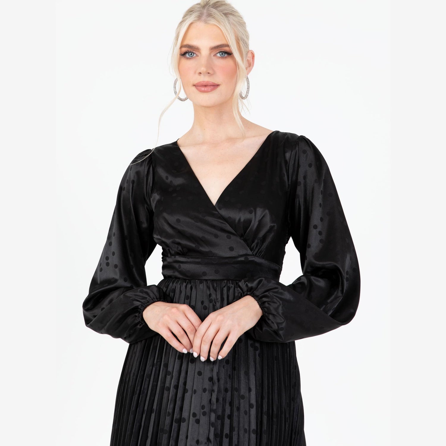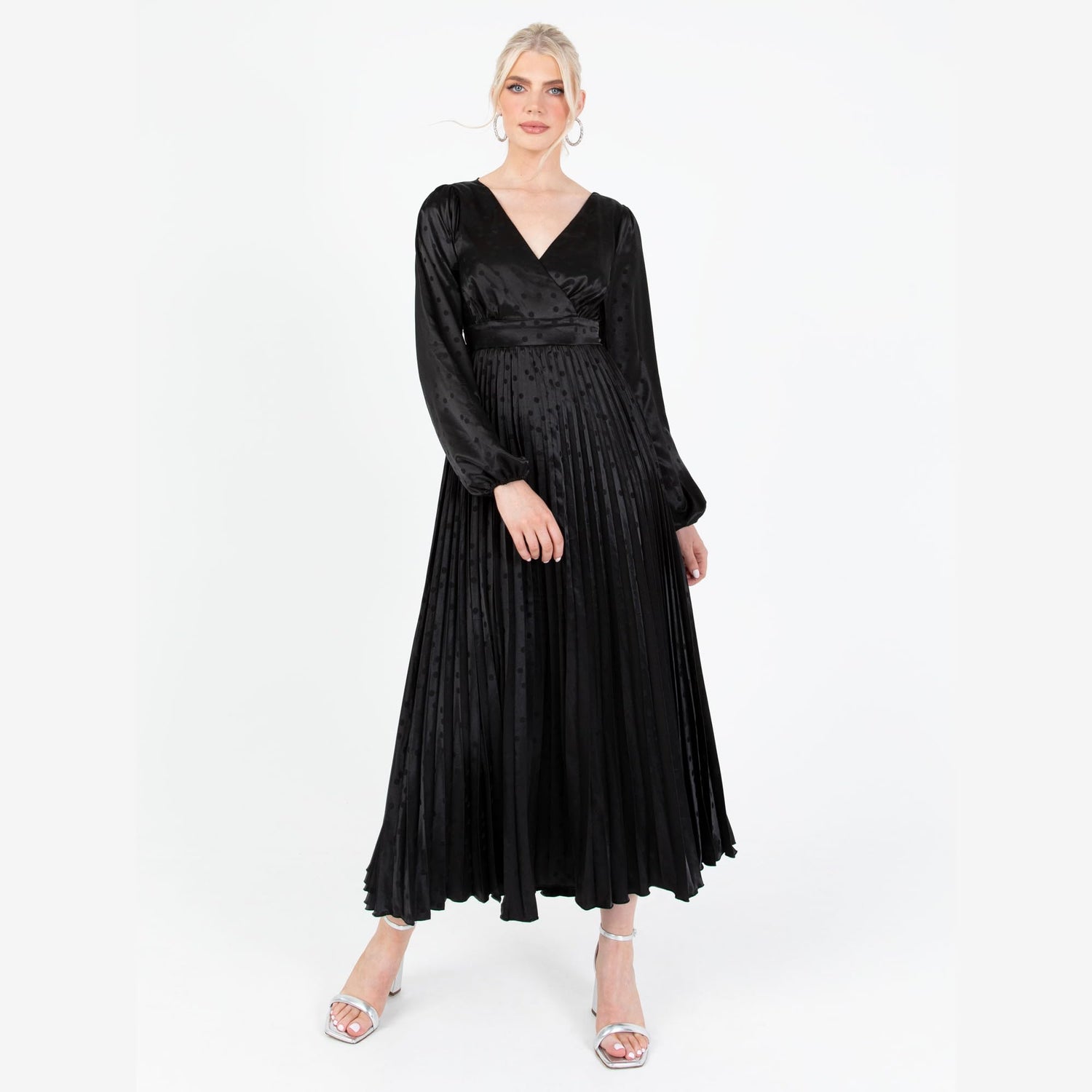Lovedrobe Women's Midaxi Dress Ladies Pleated Satin V-Neck Long Bishop Sleeve Empire A-Line for Evening Occasion Party Prom Ball Vestido, Negro, 42 para Mujer