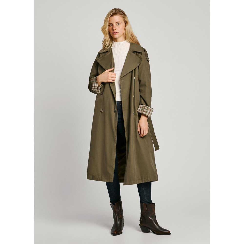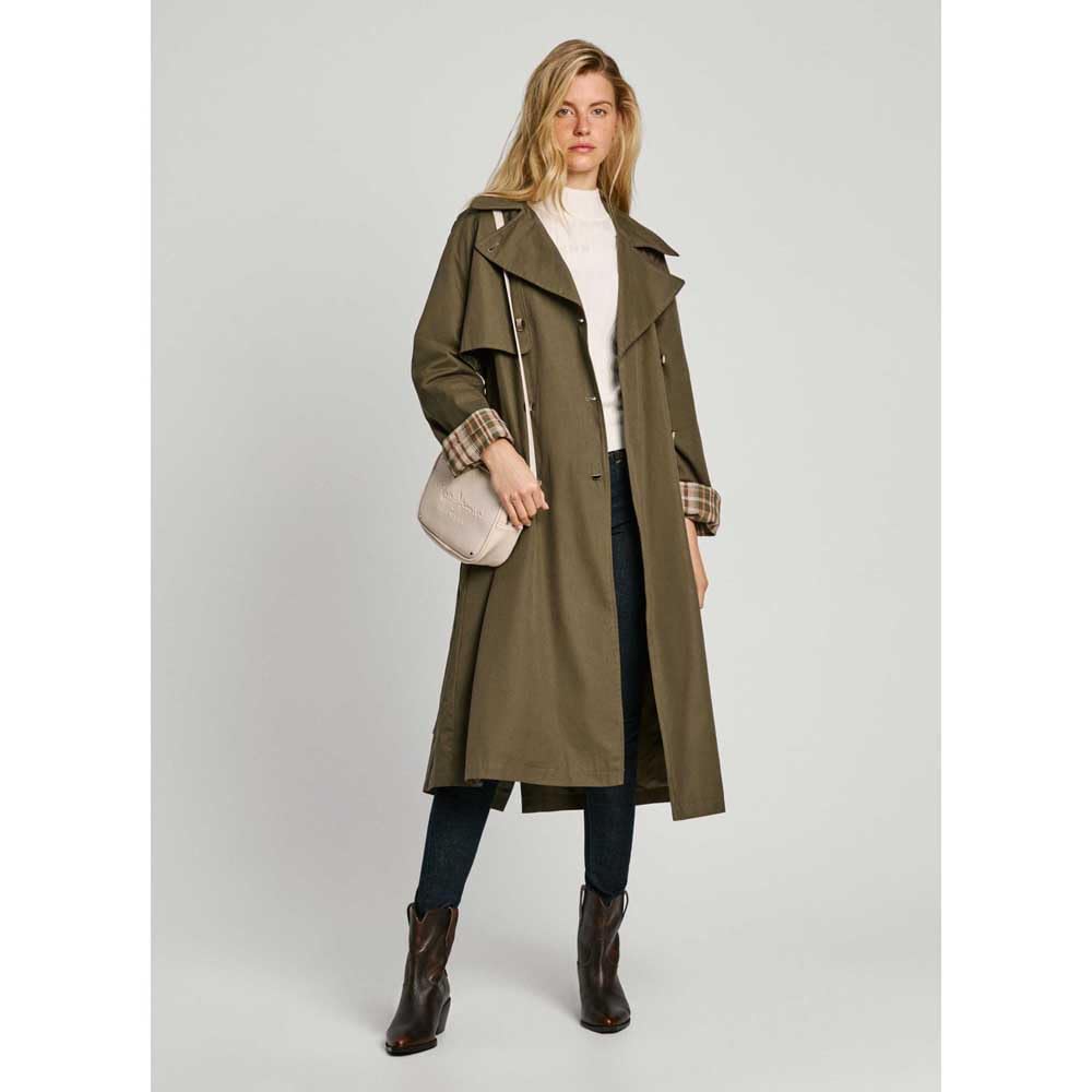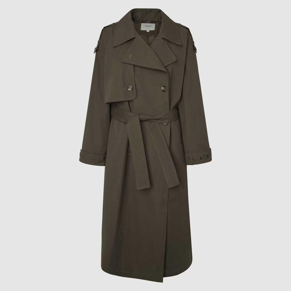 Gabardina con mangas largas Ranglan, prenda de doble botonadura cerrada con botones y cinturón con cierre de hebilla. Tiene canesú volador en la parte delantera y trasera. La parte delantera tiene charreteras y cuello de camisa; y la parte trasera tiene una abertura centrada. Puños ajustables con botón.