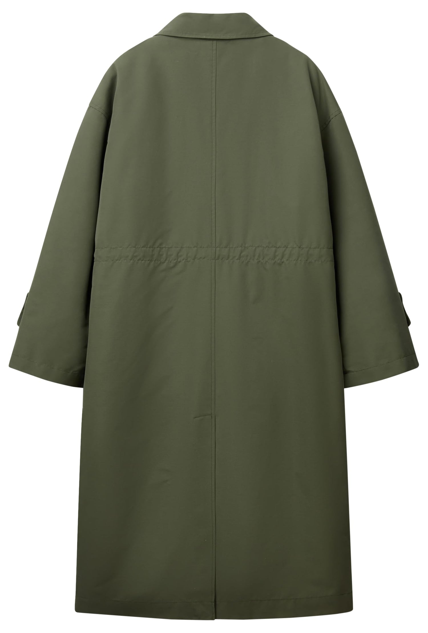 Parka larga de tejido técnico de algodón/nailon mano melocotón. Forro interior extraíble. Cierre con botones a presión. Bolsillos laterales, puño con tira abotonada. Cintura con cordón interior. Abertura central detrás