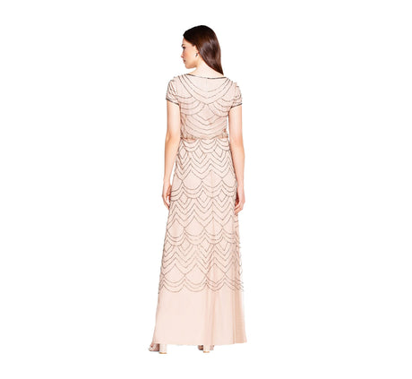 Adrianna Papell Women's Short Sleeve Blouson Beaded Gown, Taupe/Pink, 14