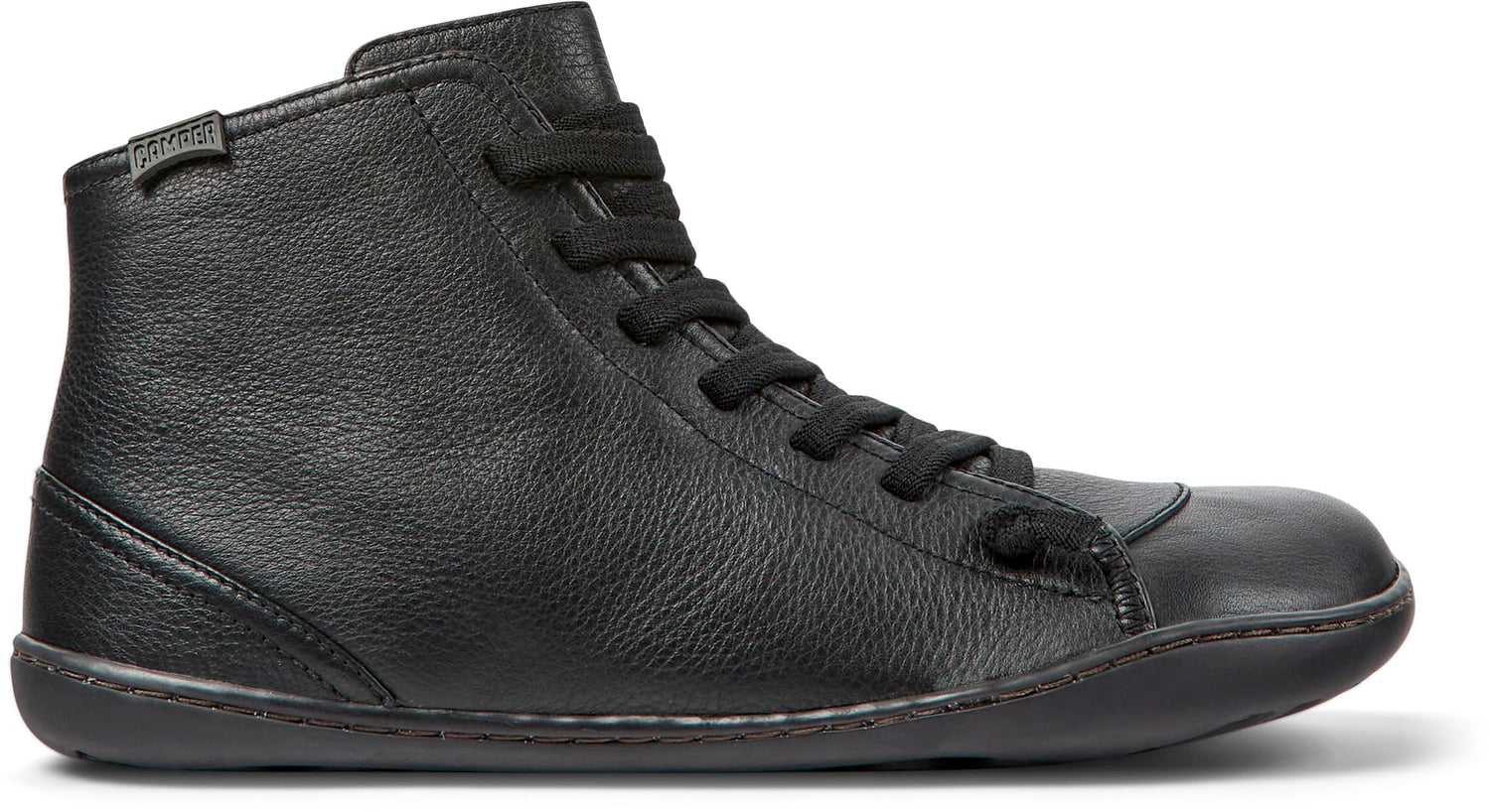 Botines negros de piel para mujer con suelas de TPU (20% reciclado). Un icono de Camper que evoluciona cada temporada. Peu es la simplicidad funcional inspirada en la acción de caminar descalzo. Está cosido en 360 grados y construido con la técnica de construcción Strobel, garantizando flexibilidad y durabilidad inigualables en situación.