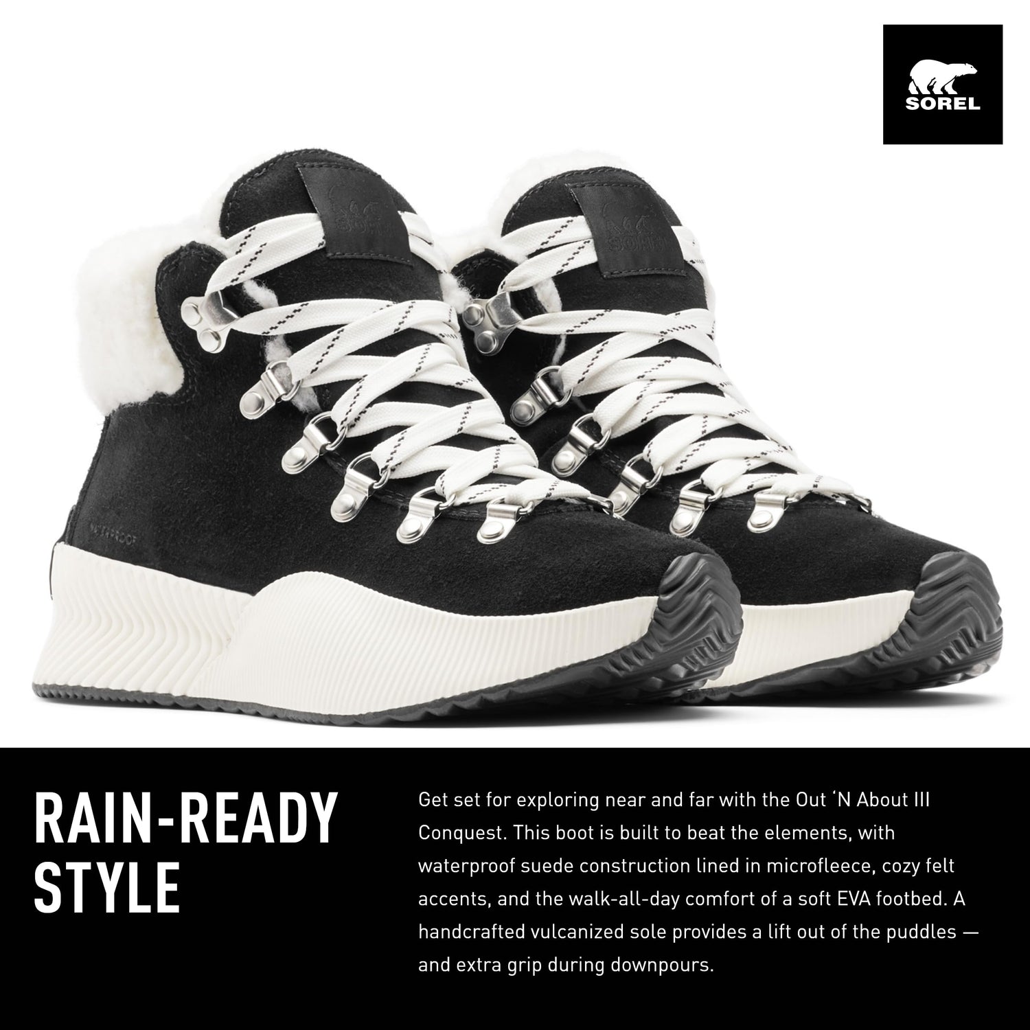 Las botas impermeables Sorel Out N About III Conquest para mujer están diseñadas para exploradores urbanos con una combinación de tenis y botas. La parte superior de gamuza impermeable y la suela de goma vulcanizada te dan tracción dondequiera que vayas.