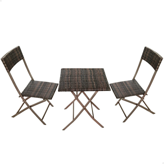 Decora tus espacios abiertos con este conjunto mesa y sillas terraza Aktive Garden en tonos marrones. Es un set perfecto para balcones o terrazas pequeñas, para tomar el desayuno e incluso para disfrutar de momentos de lectura y descanso al aire libre. Este pack de mesa y sillas terraza es muy práctico ya que se puede plegar con facilidad y guardarlo para que no ocupe espacio. Estos muebles de balcón están fabricados de ratán sintético, un material especialmente habilitado para exteriores. Es ligero, duradero, resistente a la intemperie y al agua.