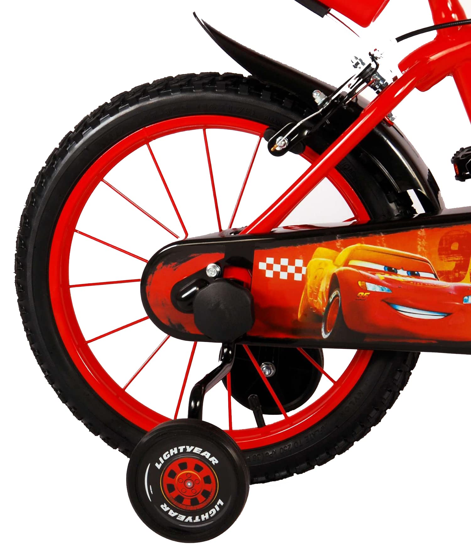 - La bicicleta infantil de 16 pulgadas de Cars está diseñada específicamente para acompañar a tus hijos en el mundo de las dos ruedas de 4 a 6 años. La bicicleta de 16 pulgadas es estable y segura gracias a las ruedas laterales extraíbles, a los neumáticos tachonados con cámara de aire y segura gracias a los frenos delanteros y traseros de tipo caliper