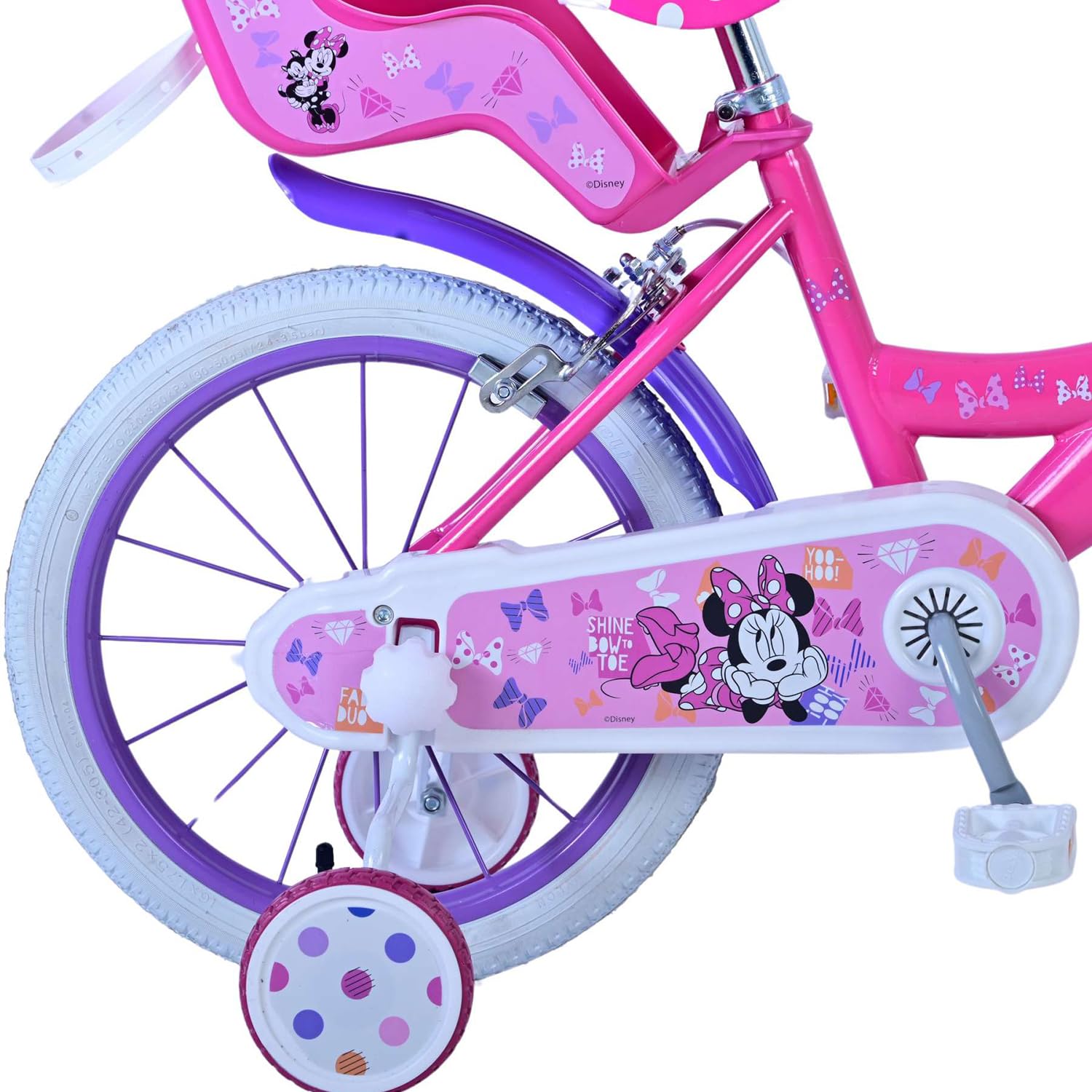 - La bicicleta de 16 pulgadas para niña de Disney Minnie está especialmente diseñada para acompañar a tus hijos en el mundo de las dos ruedas de 4 a 6 años. La bicicleta de 16 pulgadas es estable y segura gracias a las ruedas laterales extraíbles, a los neumáticos tachonados con cámara de aire y segura gracias a los frenos delanteros y traseros de tipo Caliper.