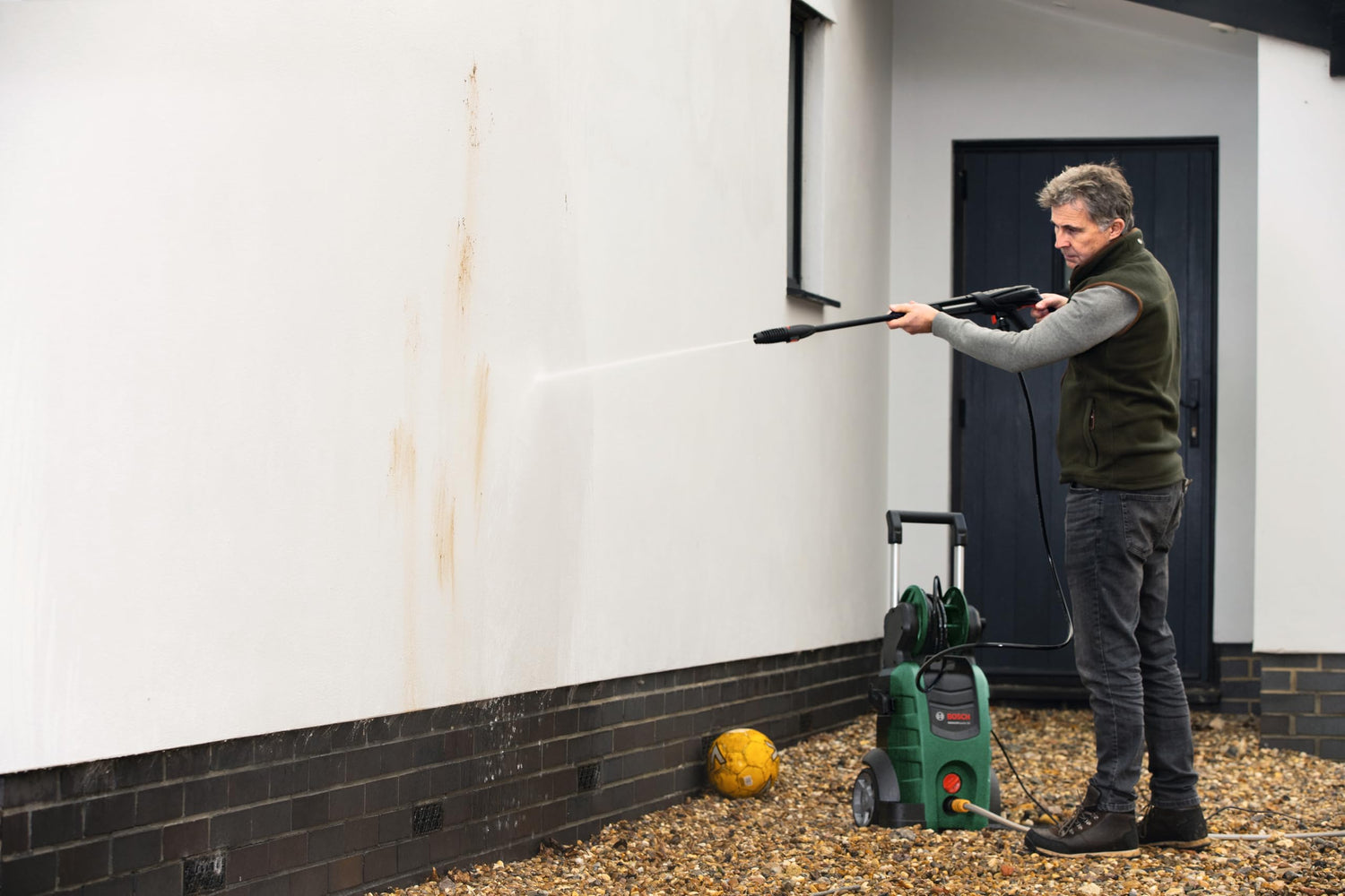 - La hidrolimpiadora proporciona 450 litros de agua por hora gracias a su potente motor de 2100 W y su presión de 140 bares.