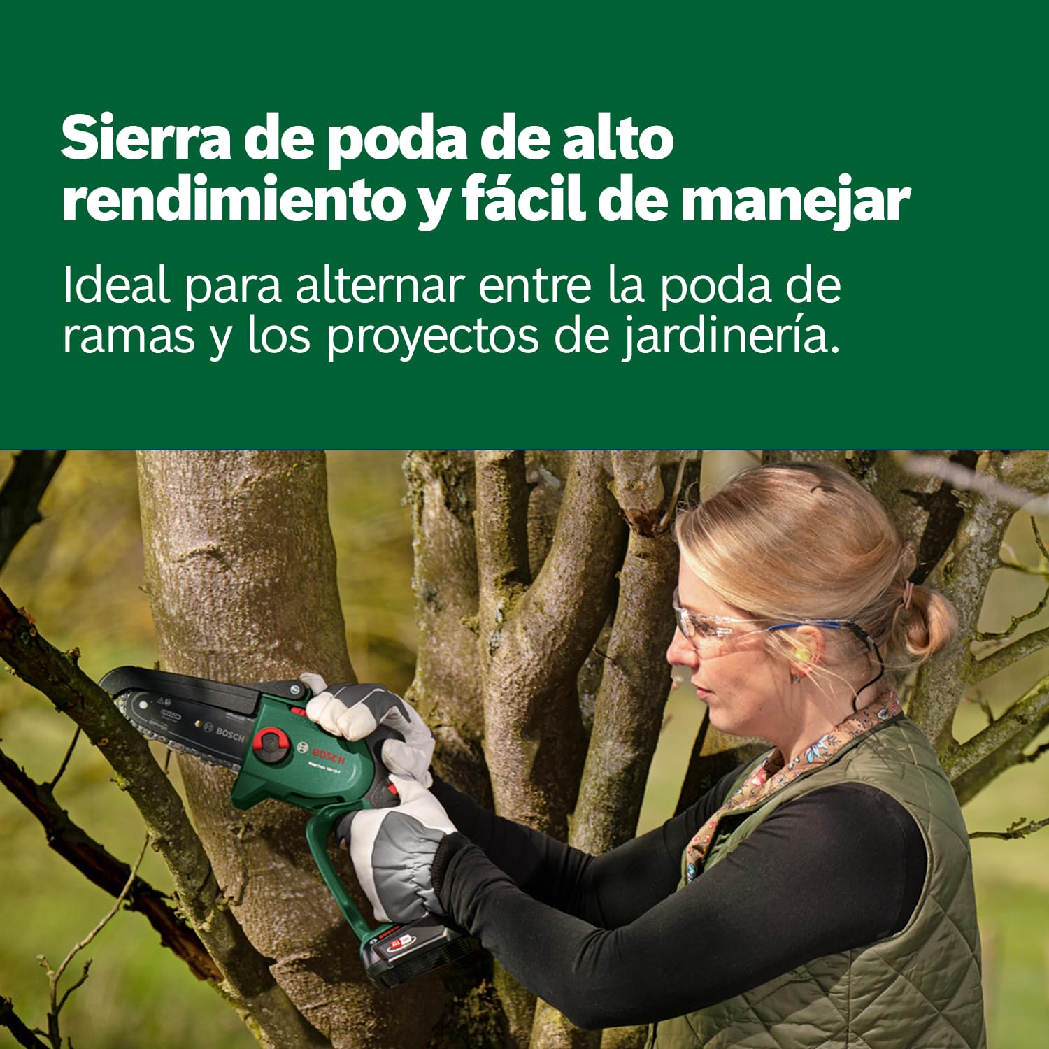 - Sierra de poda a batería diseñada para cortar árboles, podar ramas y realizar diversas tareas de bricolaje en el jardín