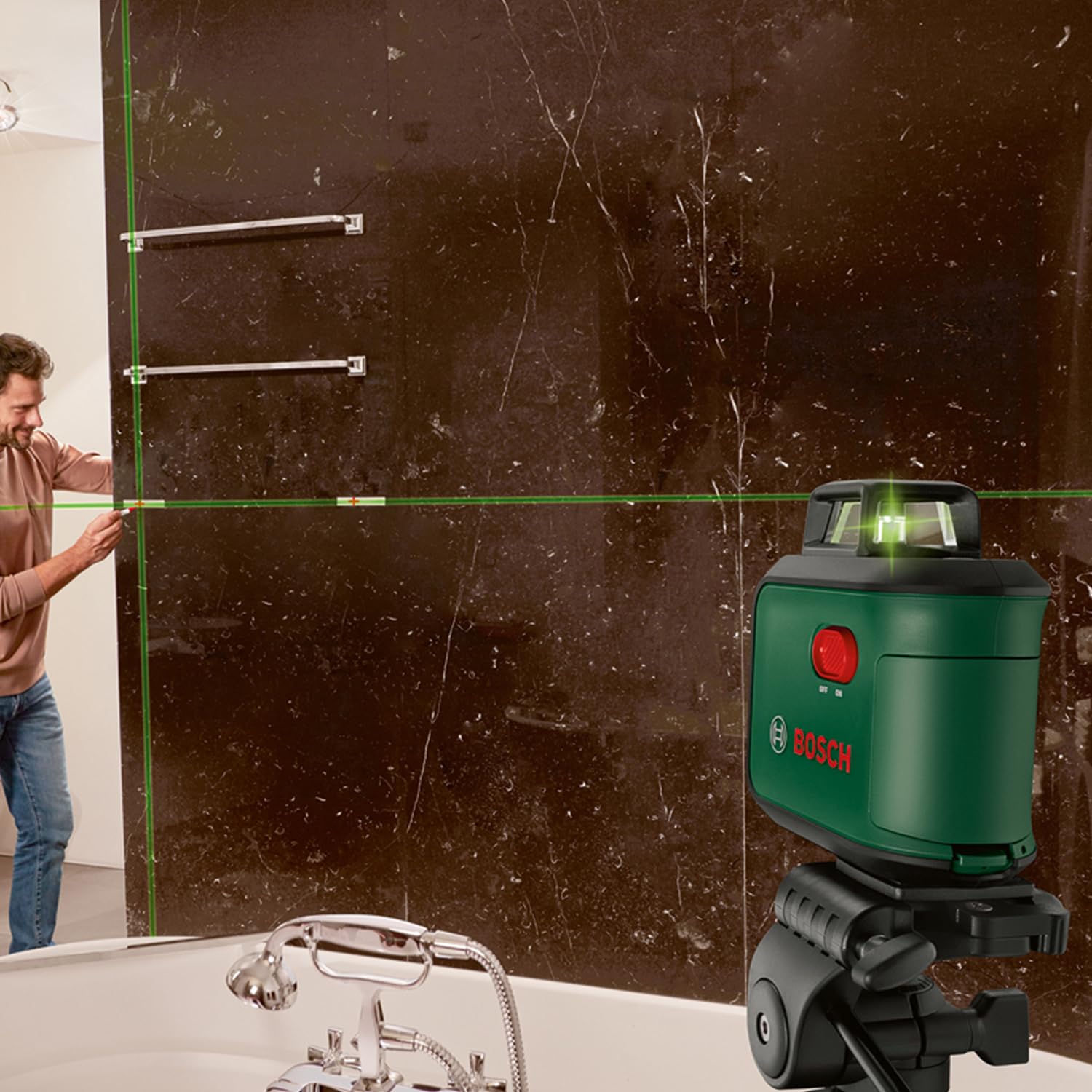 - Selección de líneas láser con un botón: el Nivel Láser tiene 1 línea láser horizontal de 360° y 2 verticales con un ángulo de 90°, además de 1 punto de plomada hacia abajo. Con la tecnología de láser verde, el nivel de líneas ofrece una visibilidad hasta 4 veces mejor que los niveles láser con líneas de láser rojas.
