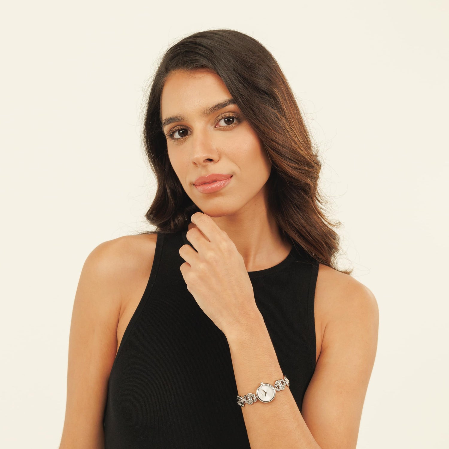 - Movimiento de Cuarzo de 2 Agujas para una Elegancia Atemporal Diseñado para ofrecer simplicidad y sofisticación, el movimiento de cuarzo de 2 agujas garantiza precisión y realza la estética refinada del reloj.