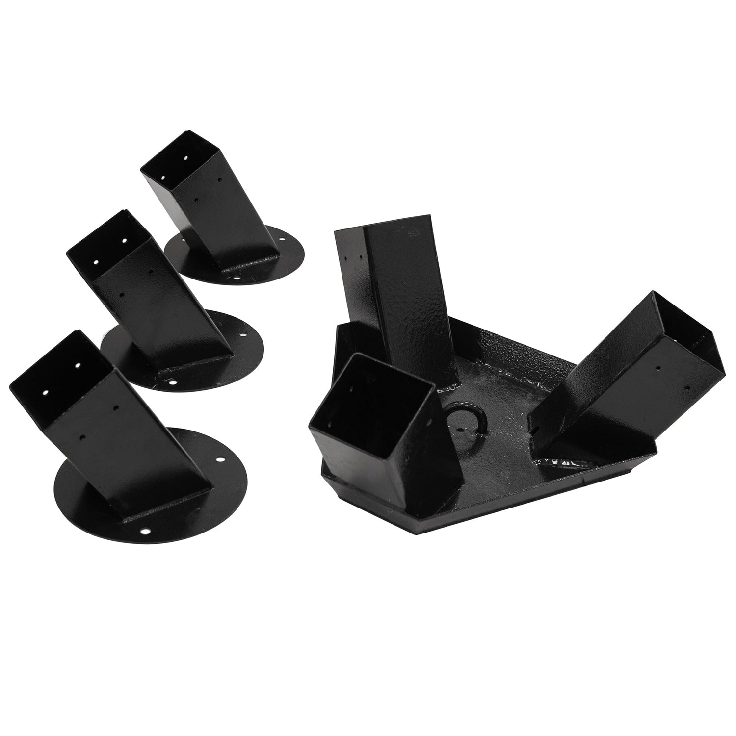 Detalles: El juego Steel Tripod Brakit de Vivere fue diseñado y desarrollado para crear una estructura fuerte de tres patas adecuada para sostener sillas colgantes y productos Cacoon. Este juego de soportes está hecho para adaptarse fácilmente a postes de 90x90 mm con una longitud óptima de 300 cm (postes no incluidos). Cada kit contiene tres unidades Brakit de base, un Brakit de conexión superior y todo el hardware de montaje necesario. Junto con tres postes de tamaño estándar de 90x90 mm, este soporte hará que su espacio al aire libre sea la envidia del vecindario.