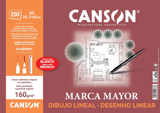 Canson Dibujo Lineal, Papel de dibujo blanco, Suave, 160gsm, Hoja, A3-29,7x42cm, Blanco, 250 Hojas