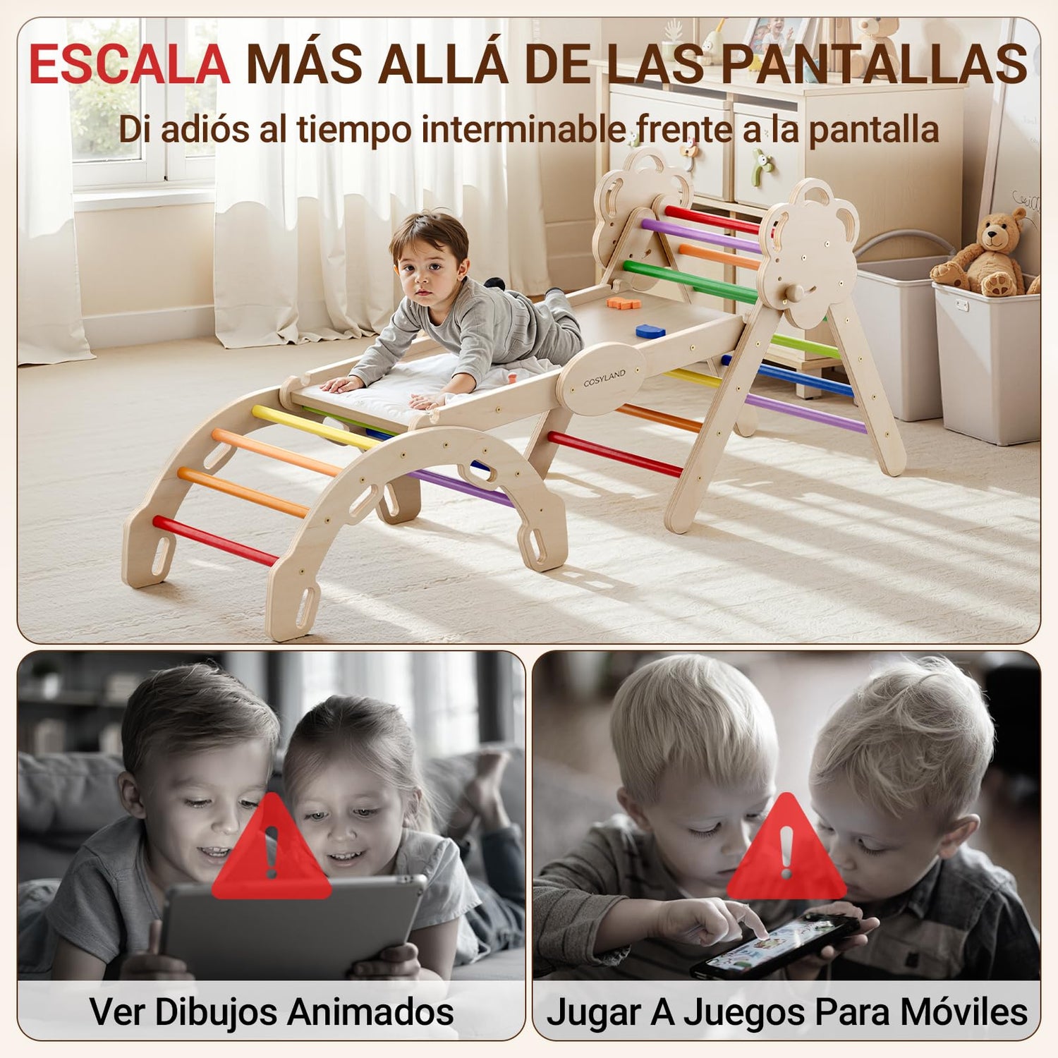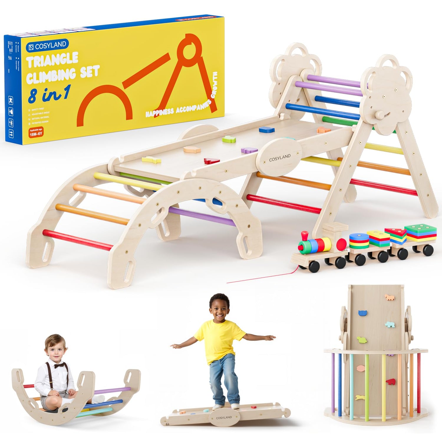 COSYLAND 8 en 1 Triángulo de Escalada Montessori con Arco y Rampa, Set Plegable Infantil, Juguete de Madera Resistente para Interior, Niños 18 Meses-6 años, Colores Arcoíris, Grande