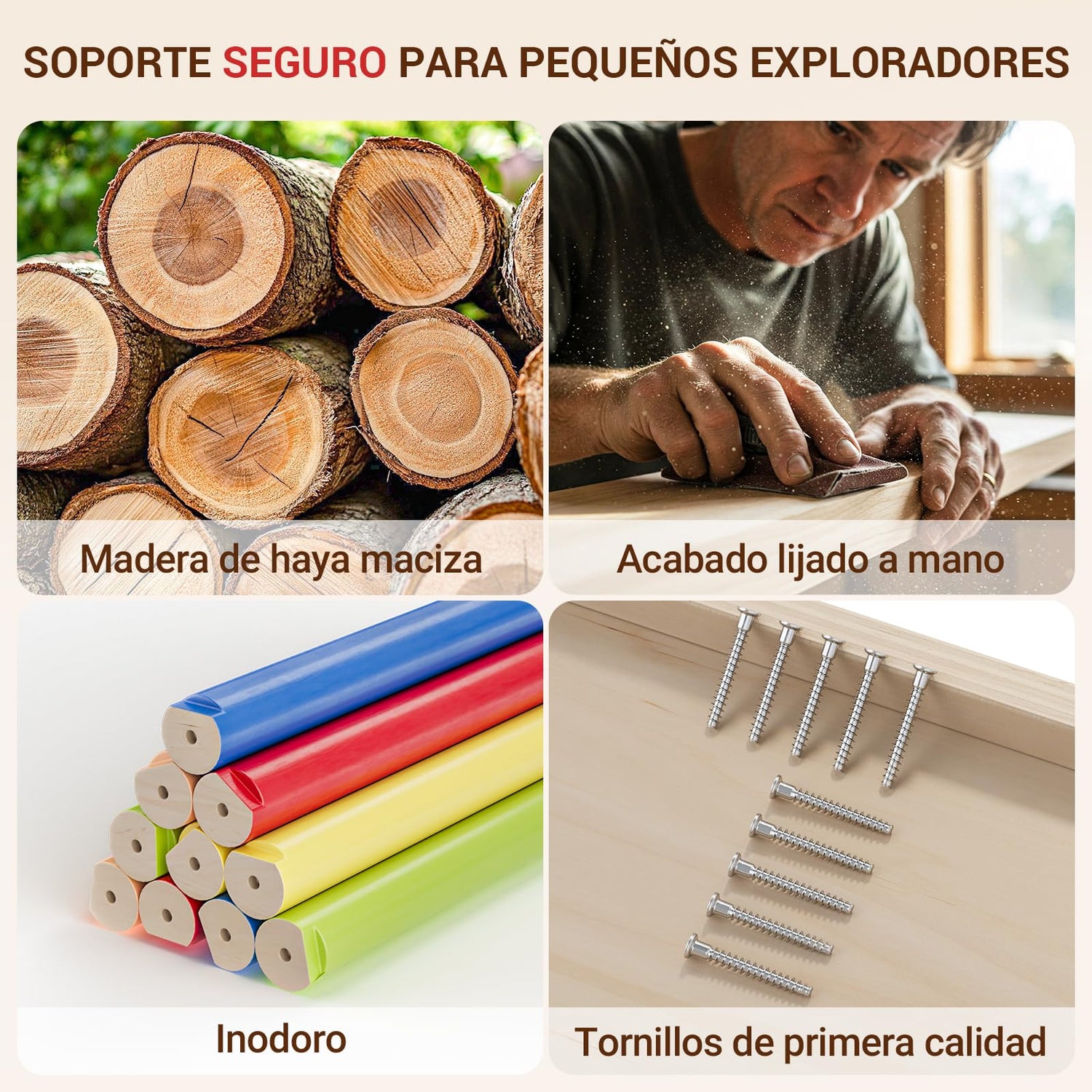 - Madera natural 100% segura y resistente: Fabricado con madera maciza natural y sometido a rigurosos controles de calidad, este conjunto garantiza máxima estabilidad, resistencia y seguridad. Su acabado no tóxico asegura que los niños puedan jugar de manera saludable y segura.