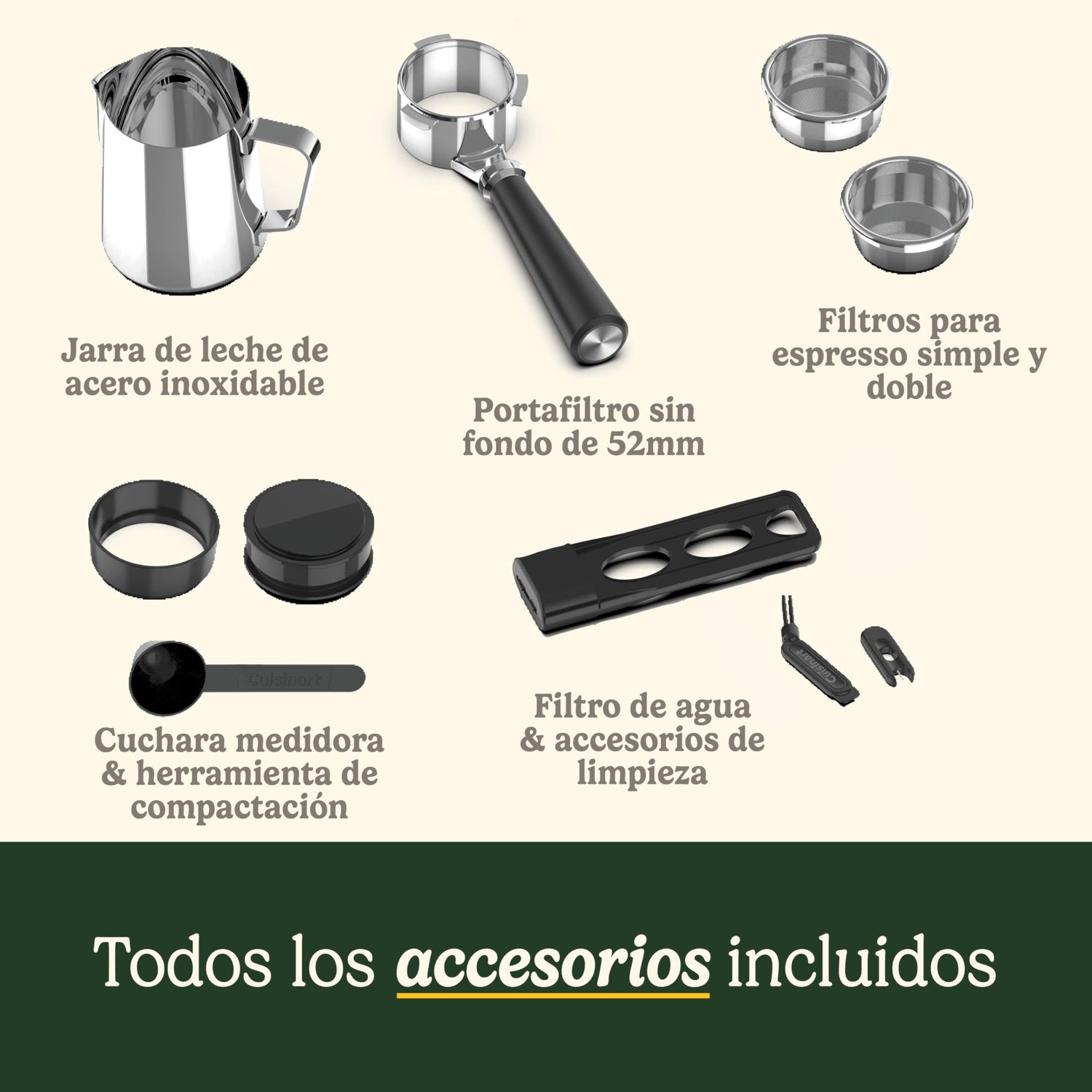 - "TODO LO QUE NECESITAS PARA EMPEZAR Incluye todos los accesorios para empezar como un profesional: jarra de leche de acero inoxidable, filtros para una y dos dosis, cuchara medidora y prensador."