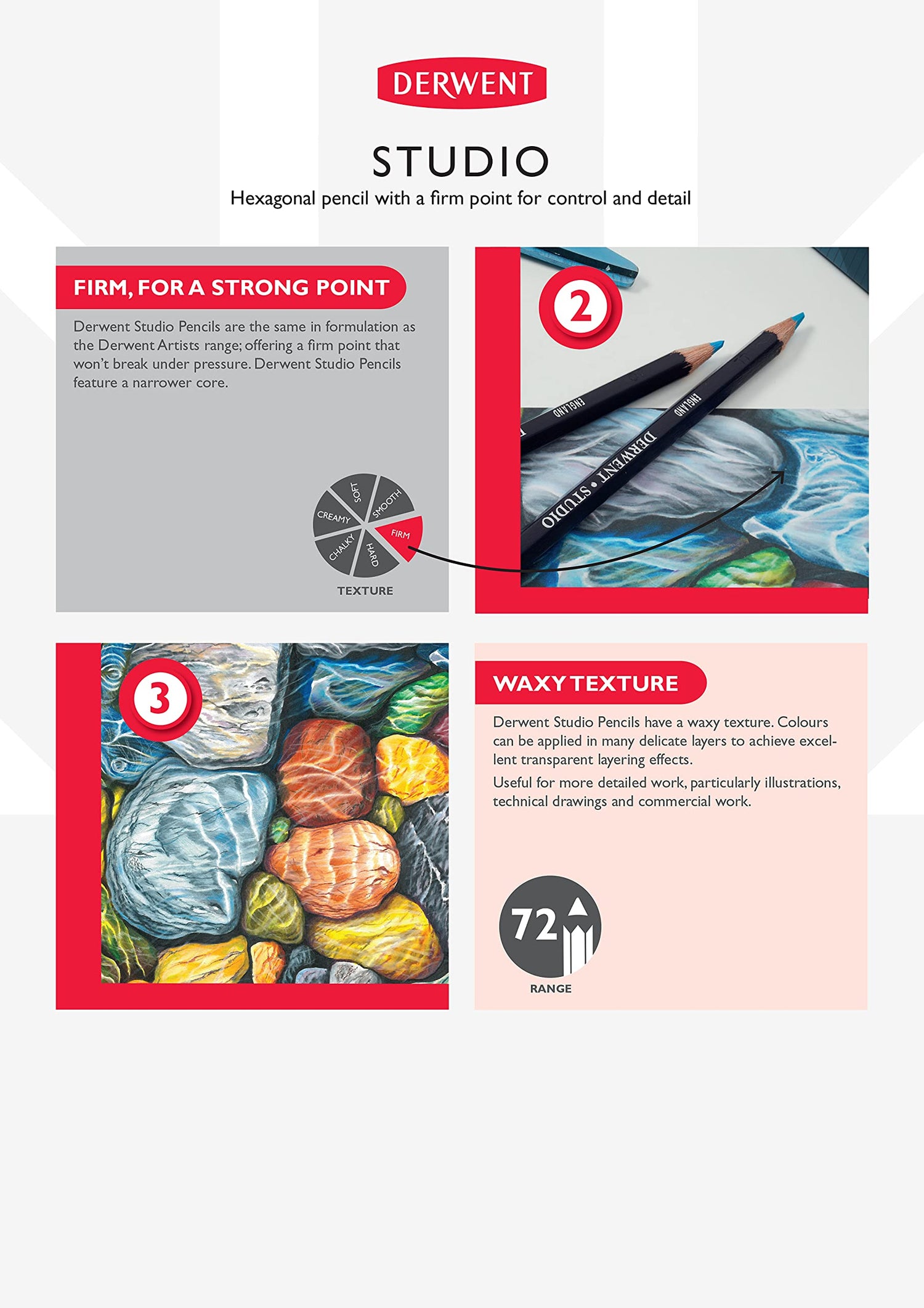 - Incluye: 1 x Set de 48 Lápices de Colores Derwent Studio, nombres y números de colores grabados en plata, lápices hexagonales antivuelco aptos para usar con sacapuntas estándar
