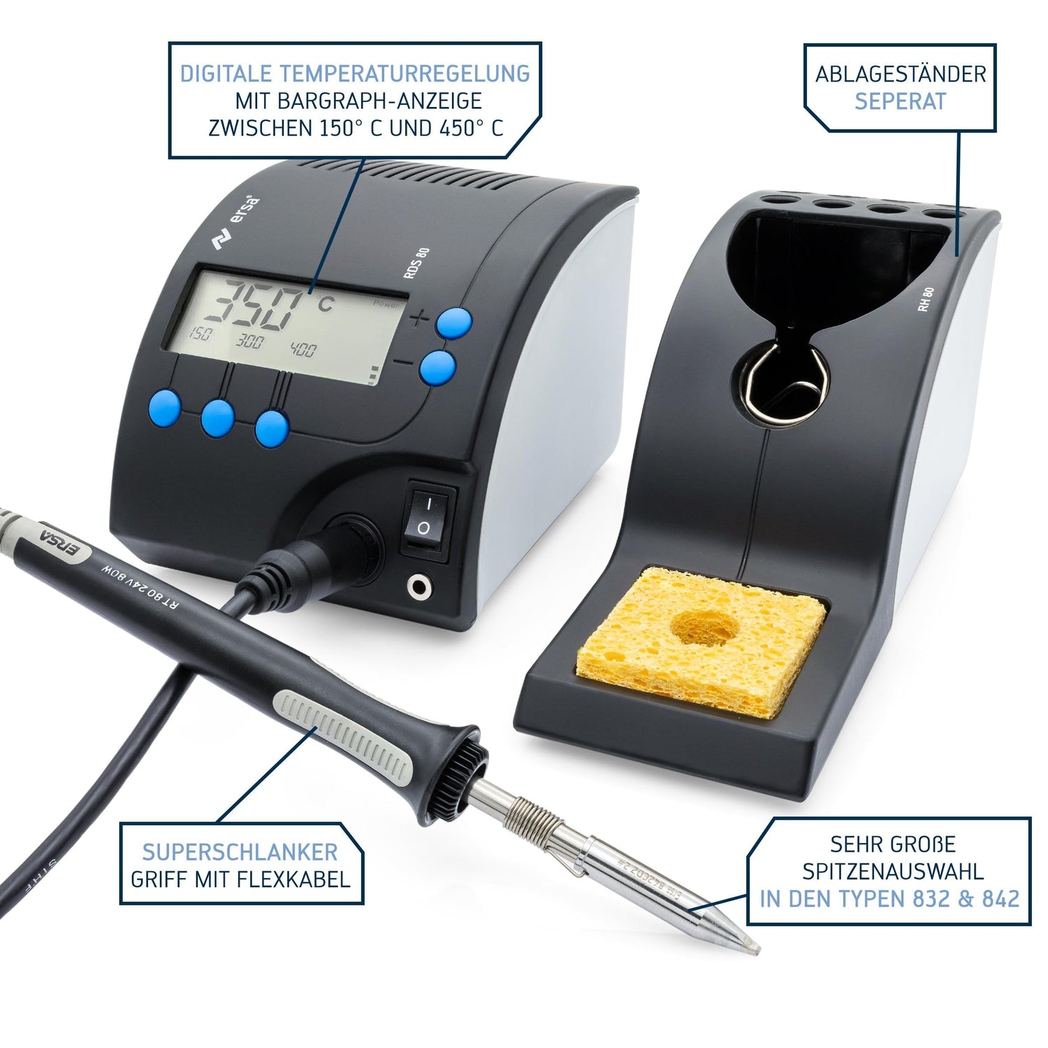 La estación de soldadura ERSA RDS 80 está controlada por el procesador y, además de la selección directa de 3 temperaturas programables, ofrece otras funciones útiles, como funciones de modo de espera y apagado automático, así como una pantalla LC grande y fácil de leer.