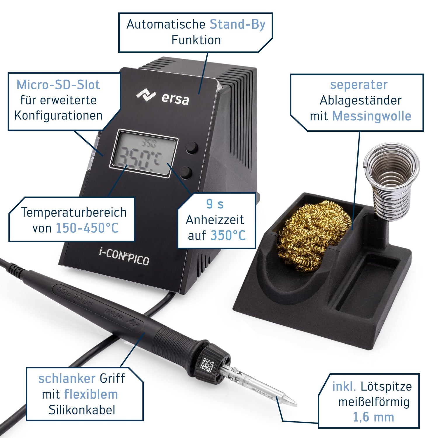 ERSA i-CON PICO MK2 - Estación de soldadura digital (80 W, 150-450 °C, con soldador i-TOOL PICO MK2 ergonómico con cambio Tip`N Turn + punta de soldadura de 1,6 mm con autonomía automática)