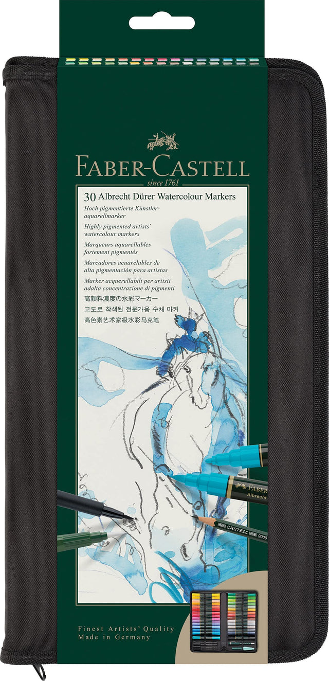 Faber-Castell 160301 Albrecht Dürer - Estuche con Cremallera de 30 Marcadores Acuarelables - Doble Punta para Artistas - 4 PITT® Artist Pen - 1 Pincel con Depósito - 1 Lápiz Castell 9000