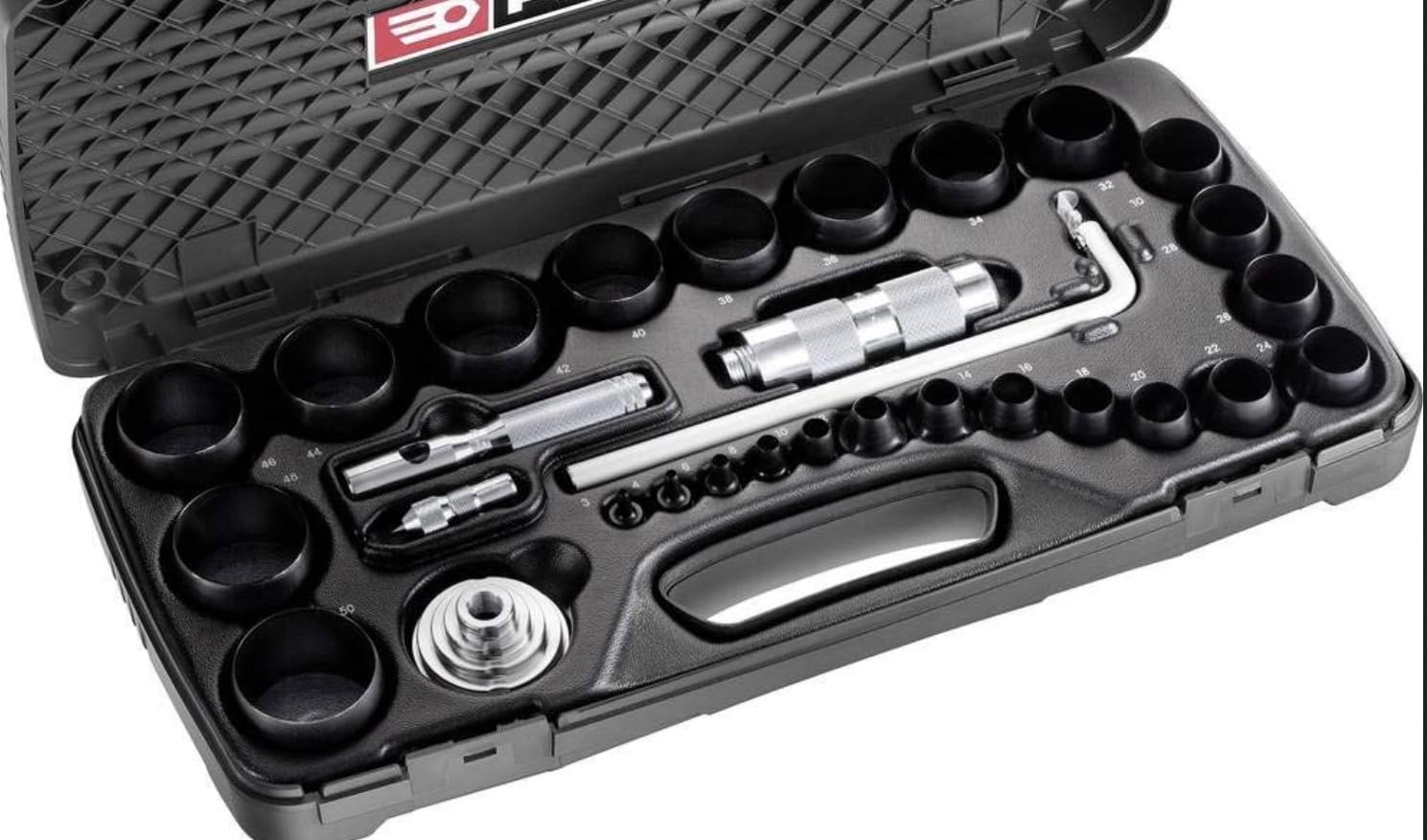FACOM Juego de troqueladoras para juntas de 26 piezas, Fabricación de juntas circulares, composición para cortar juntas de hasta 50 mm, troqueladora y brújula, varias dimensiones, 245.J2A