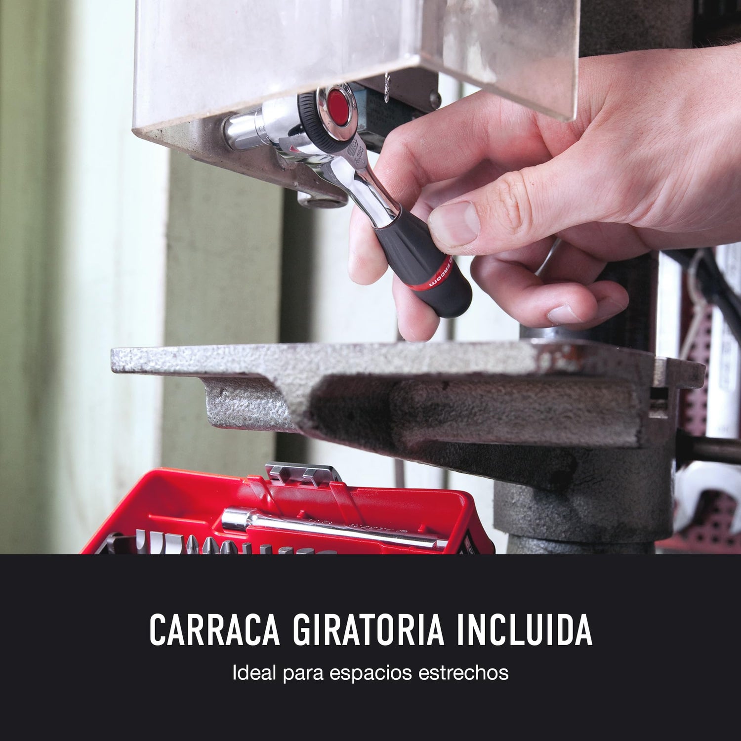 - INCLUYE CARRACA DE GIRO: Equipada con un mecanismo rotatorio que permite accionar las puntas de 1/4" girando el mango. Ideal para espacios estrechos.