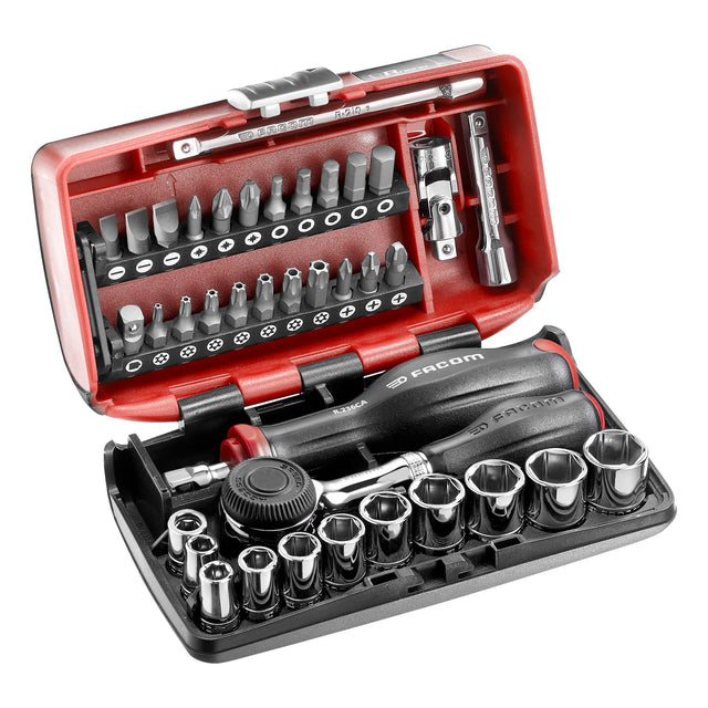 FACOM Juego de Vasos 1/4" y Puntas de Atornillado, 38 Piezas, Compacto y Performante, Incluye Cliquet Rotativo 360°, Pozidriv, Phillips y Resistox, R.360NANOPB
