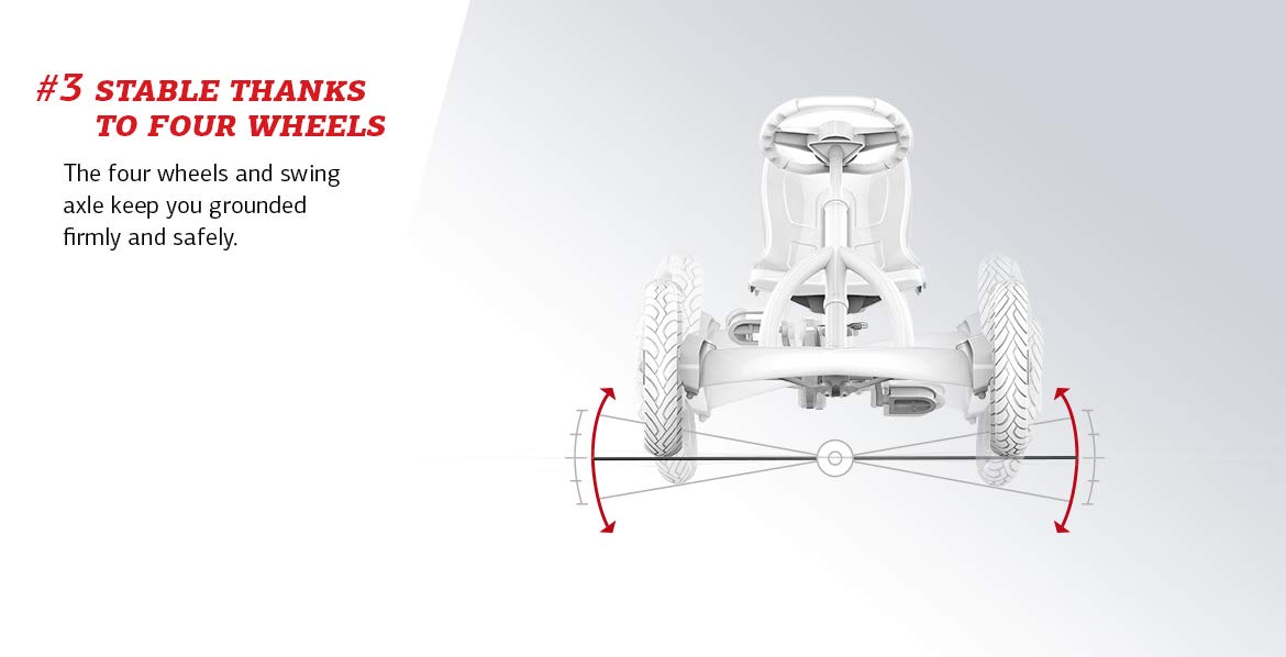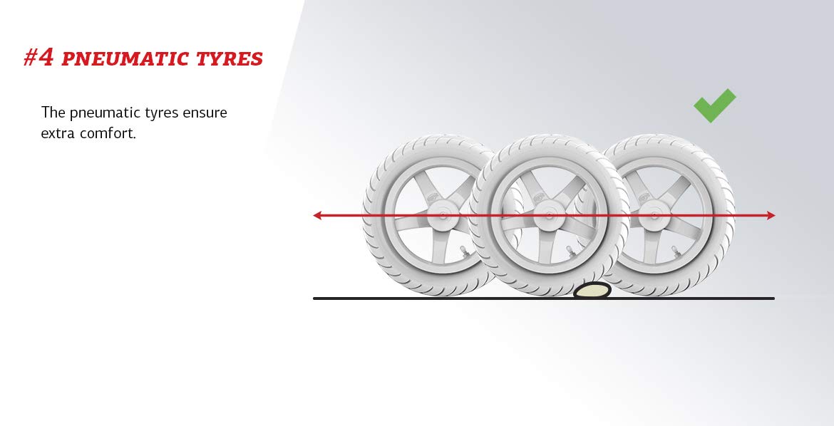 - Rápido y suave gracias a las ruedas de rodamiento de bolas con neumáticos de aire todoterreno