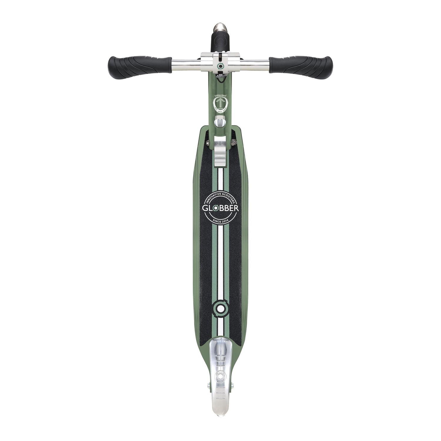 Globber - Flow Element Lights - Patinete Plegable de 2 Ruedas con luz LED, Freno Trasero y Manillar Ajustable, Desde los 5 años, para niños y Adolescentes - Verde Oliva