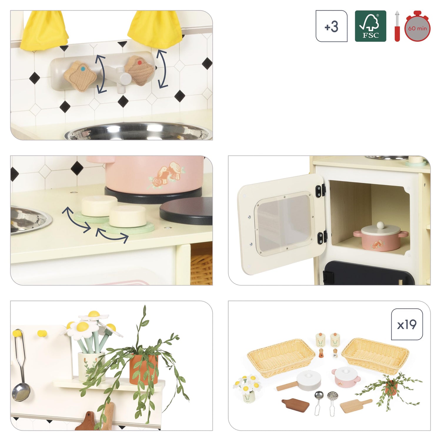 ¡Cuidado, pequeños chefs! Llegan los invitados, ¡rápido, todos a la cocina! Esta gran cocina tiene todo lo necesario para preparar un festín digno de tal nombre. Con una sartén y una cacerola con tapa, un cucharón, una espumadera, dos tablas de cortar, un salero y un pimentero, dos tarros de especias, un jarrón con cinco flores y una planta verde, ¡estás listo para impresionar! Hay dos grandes cestas para guardar todos estos trastos. Los fogones permiten asar o cocer a fuego lento y regular la temperatura mediante mandos giratorios y acústicos. Para los más golosos, la cocina está equipada con dos hornos: uno para asar carne y otro para hornear pasteles. Una vez terminada la comida, ¡hay que fregar! Por suerte, hay un fregadero grande y un grifo con mandos giratorios para ajustar la temperatura. Juguete de imitación fabricado con madera FSC™, perfecto para niños a partir de 3 años. Así que, en sus marcas, listos, ¡a cocinar!