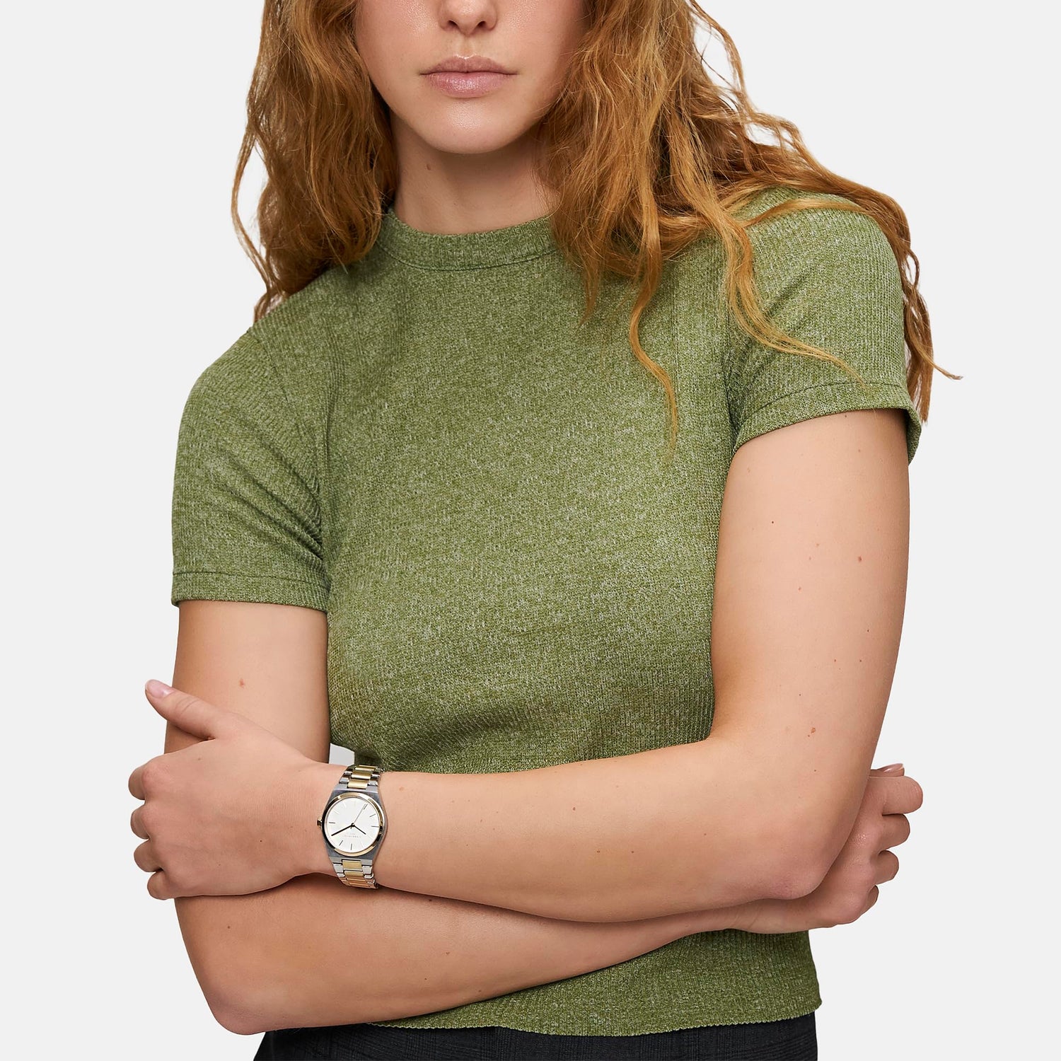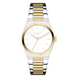 - Carcasa de acero inoxidable bicolor plateado/dorado parcialmente mate, diámetro de 34 mm; cristal mineral resistente a los arañazos, resistencia al agua probada hasta 5 bar/ATM