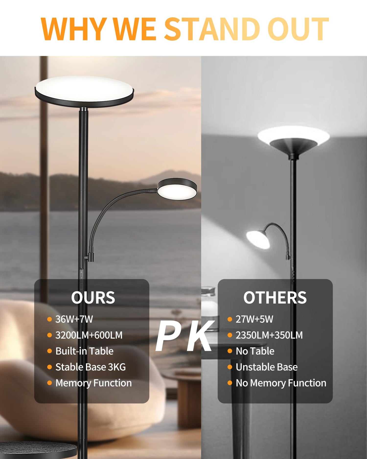 LuminexDesigns Lámpara de Pie LED con Mesa, 36W+7W Regulable 3200LM+600LM con Mando, Cabezal Giratorio 350°, 2700K-6500K, Lámpara Moderna para Salón Negra
