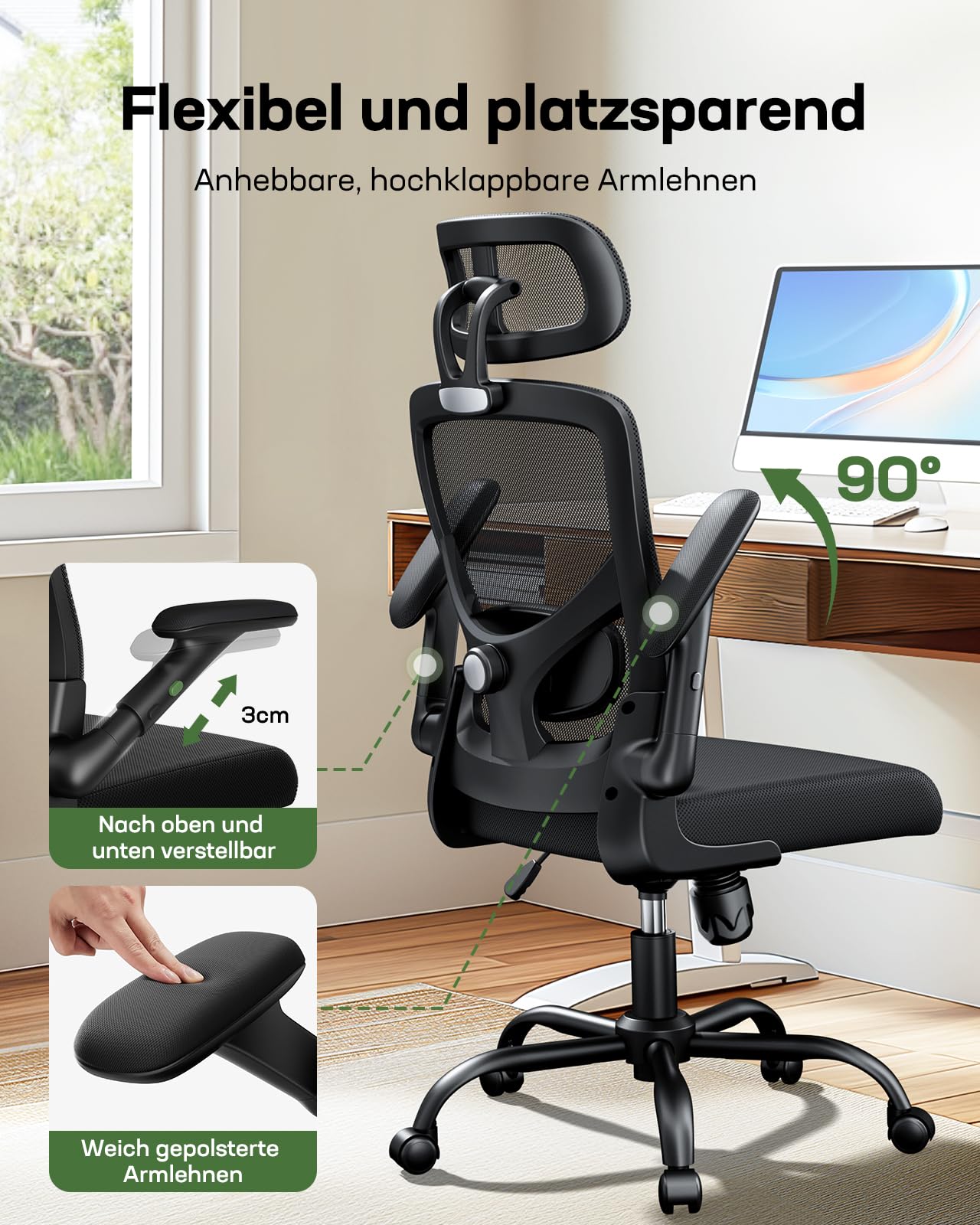 • Reposabrazos abatibles para mayor comodidad: la silla ergonómica para juegos tiene reposabrazos 2D con acolchado suave que se pueden ajustar 3 cm hacia arriba o hacia abajo para una altura óptima del escritorio. Dobla los reposabrazos 90° hacia arriba para deslizarlos debajo del escritorio y maximizar tu espacio.